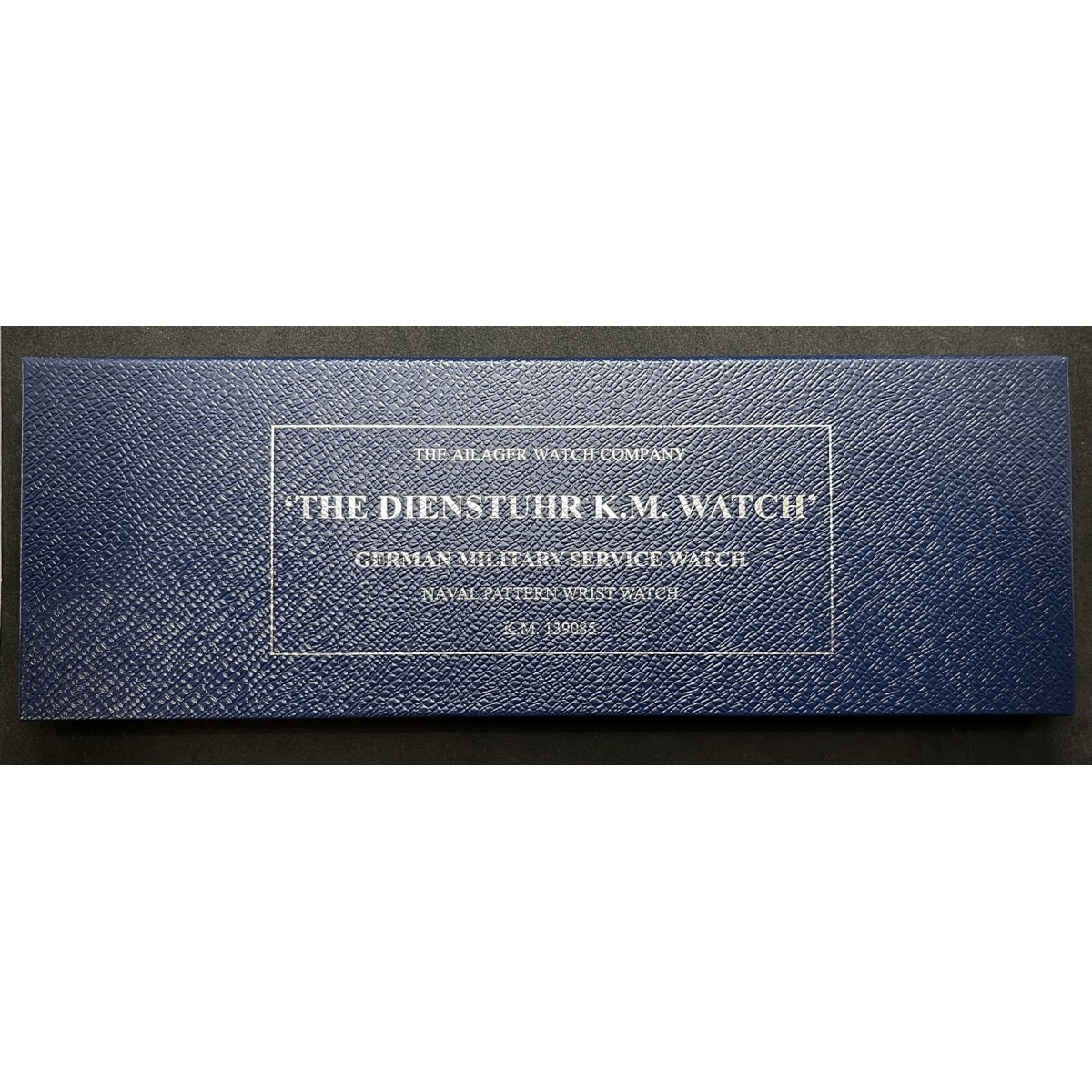 Jede Uhr wird mit einer eigenen blauen Markenbox mit den Maßen 26 cm x 9 cm x 2 cm und einer ausziehbaren Schublade geliefert, die die Uhr vor einer eleganten schwarzen Filzpolsterung präsentiert.