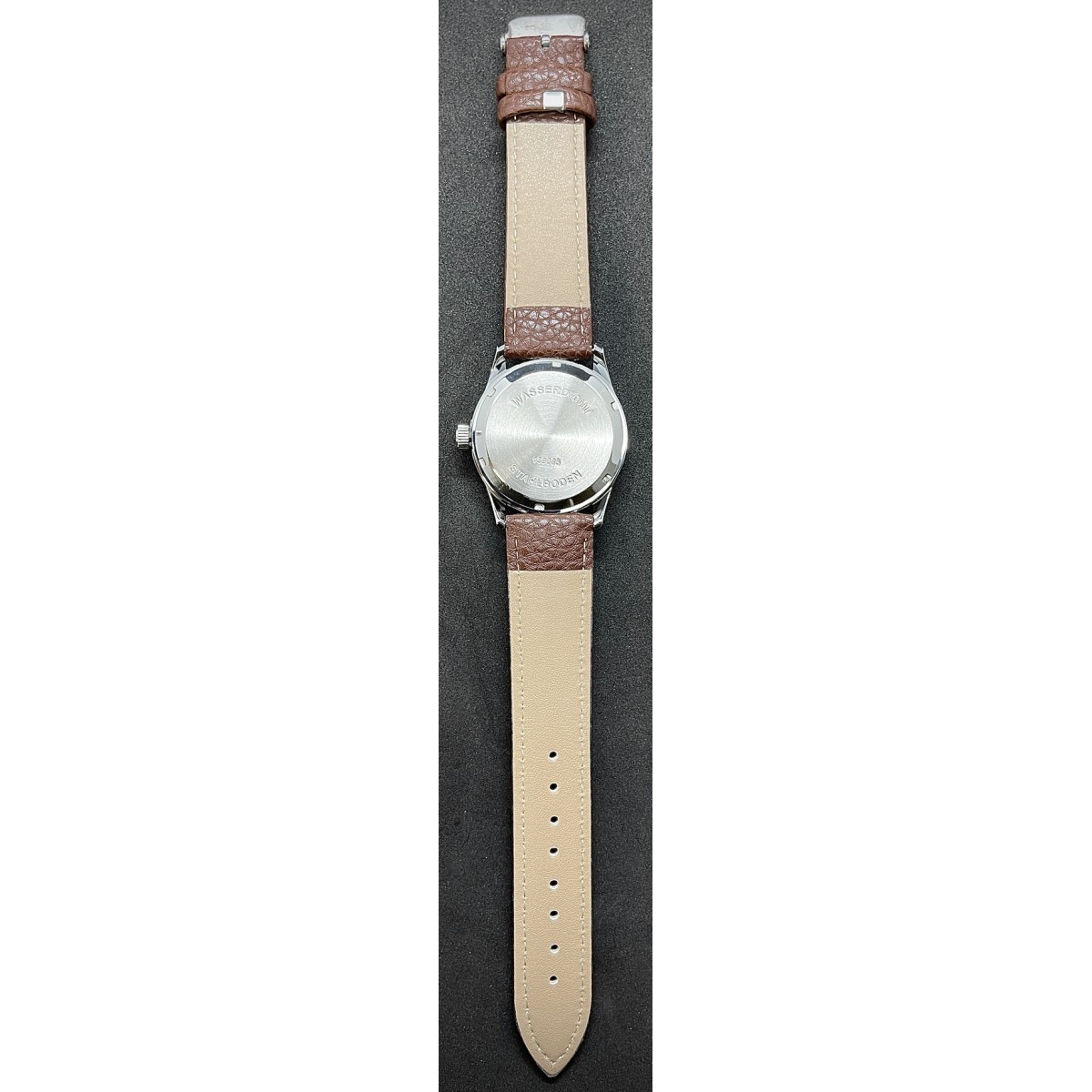 Die Uhr verfügt über ein batteriebetriebenes Doppelquarzwerk mit einem Sekundenzeiger, der „tickt“, anstatt zu schwenken.