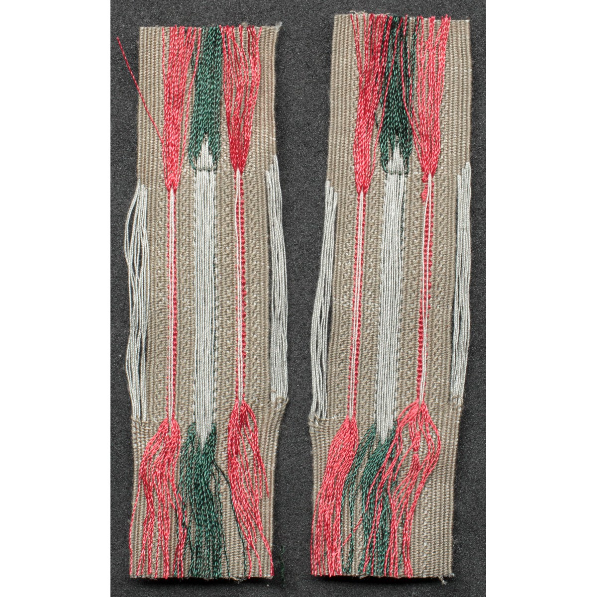 Diese BeVo-gewebten Litzen mit roter Waffenfarbe gehörten zur Uniform der Artillerietruppen der Wehrmacht. Die Kragenspiegel wurden an der Feldbluse getragen und kennzeichneten Mannschaften und Unteroffiziere. Die rote Waffenfarbe stand traditionell für Artillerieeinheiten des deutschen Heeres.