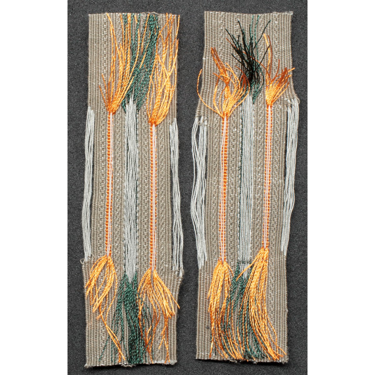 Typically the tabs consisted of a feldgrau cloth base with the Litzen pattern woven in light grey or silver thread, mounted on a backing displaying the orange Waffenfarbe.