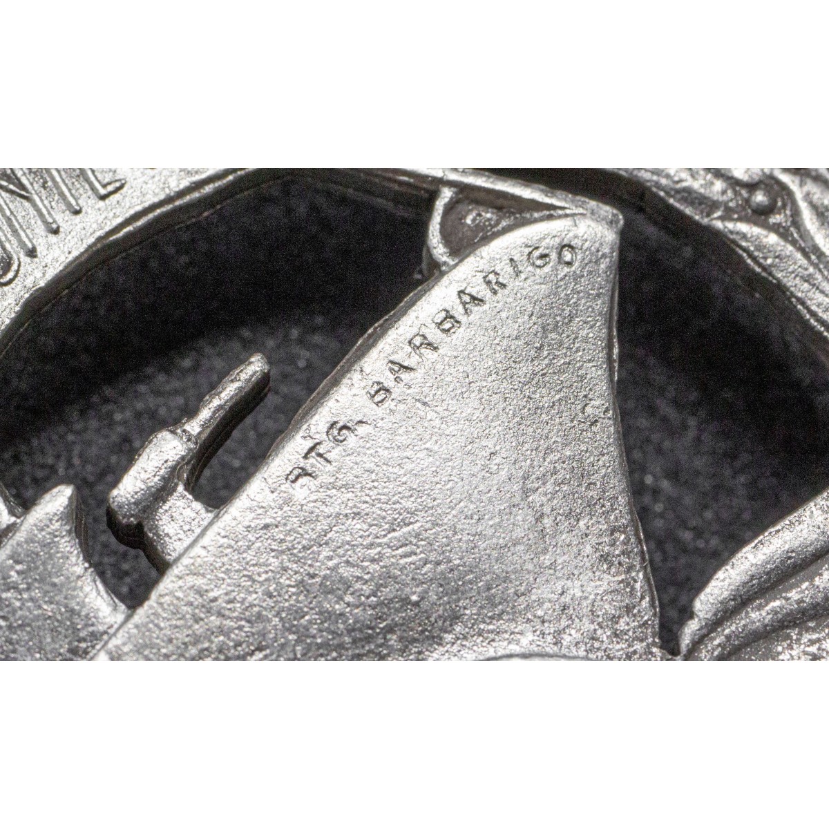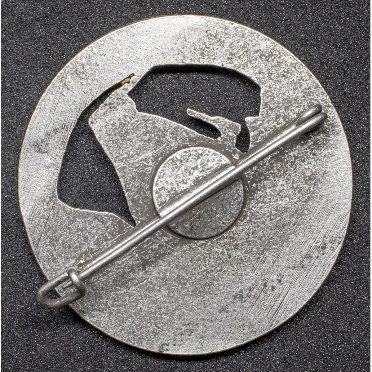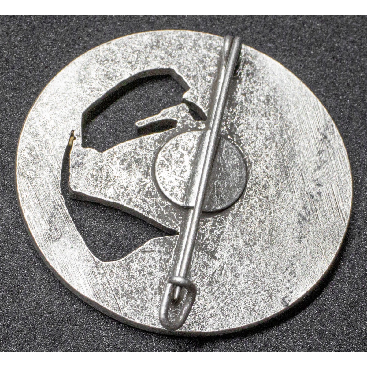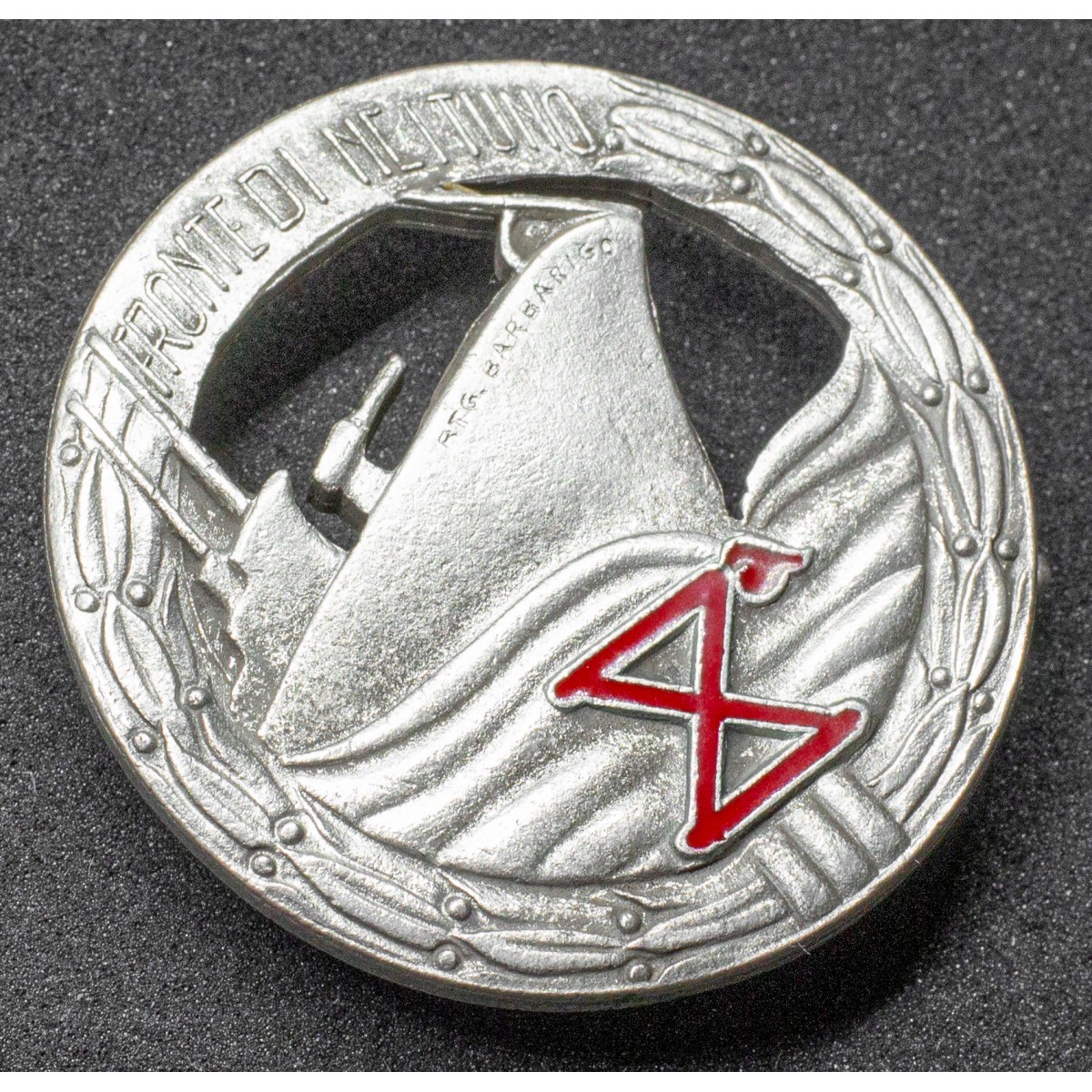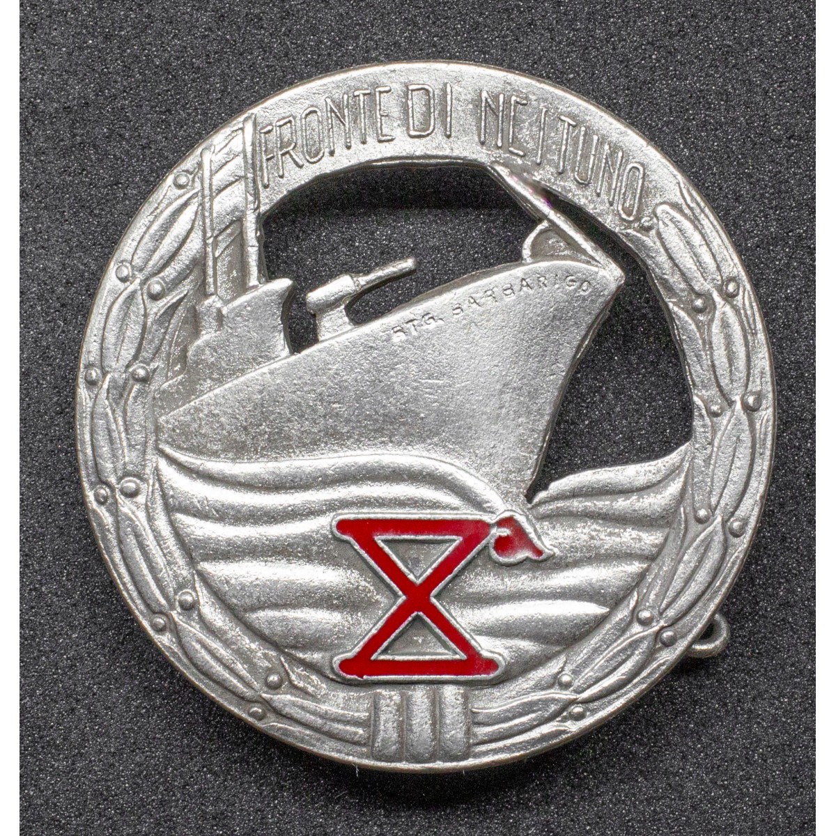 Metallabzeichen, 40,40 mm, 2. Typ mit schräger Nadel und Trägerplatte auf der Rückseite. Verliehen an Veteranen des „Barbarigo“-Bataillons an der Nettuno-Front. Zeigt einen Schiffsbug auf stilisierten Wellen, umgeben von einem Kranz mit rotem „X“ der Decima MAS in der Mitte.