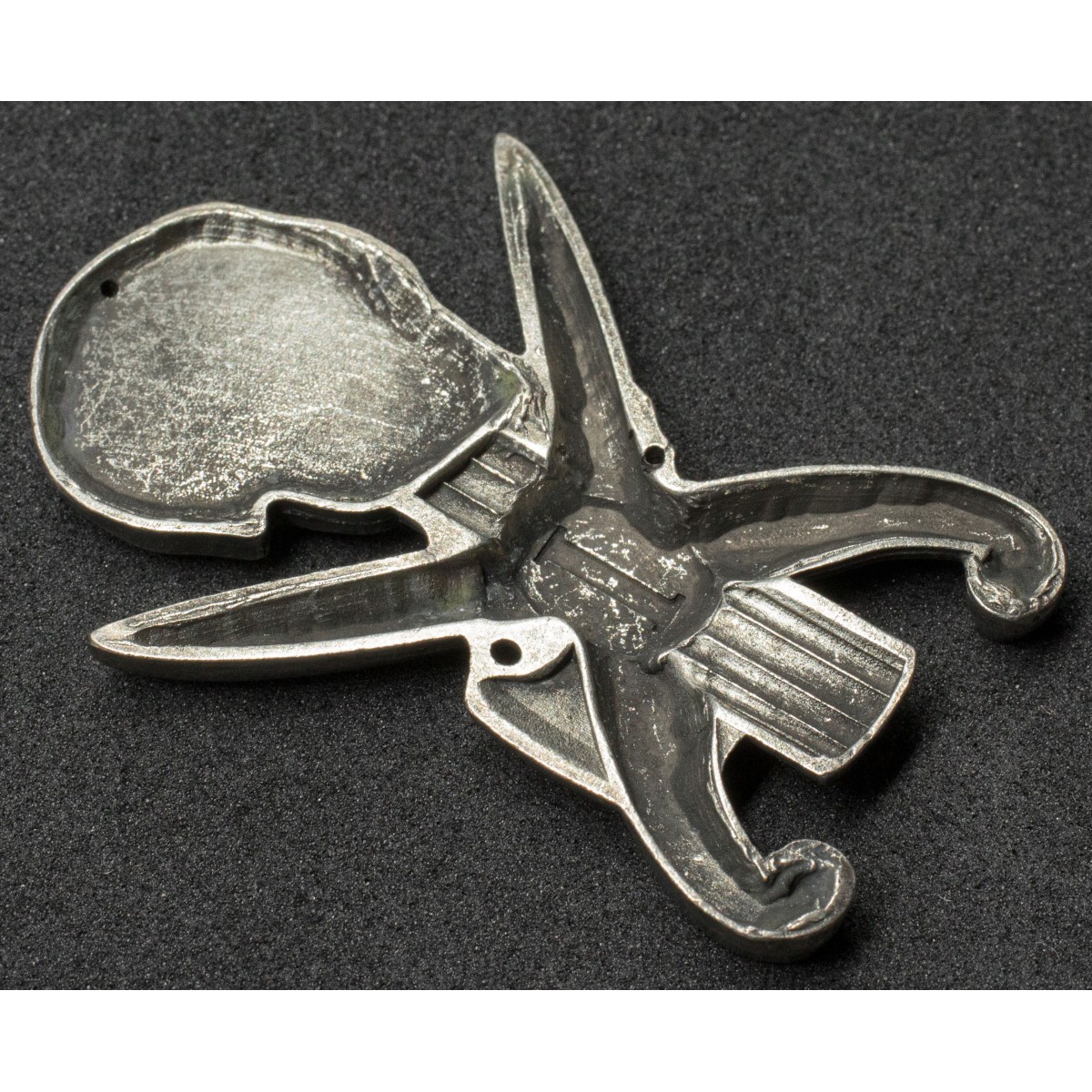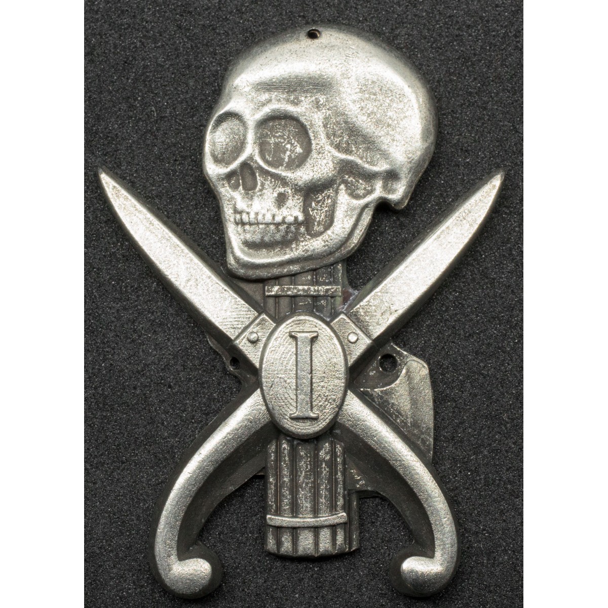 Mützen- bzw. Uniformabzeichen des Bataillons „Volontari di Sardegna – Giovanni Maria Angioy“. Das Abzeichen zeigt einen Totenkopf über einem Liktorenbündel und zwei gekreuzten sardischen Messern („Pattadesi“). Es kennzeichnete die Angehörigen eines 1943 aus sardischen Freiwilligen gebildeten Bataillons der Italienischen Sozialrepublik.