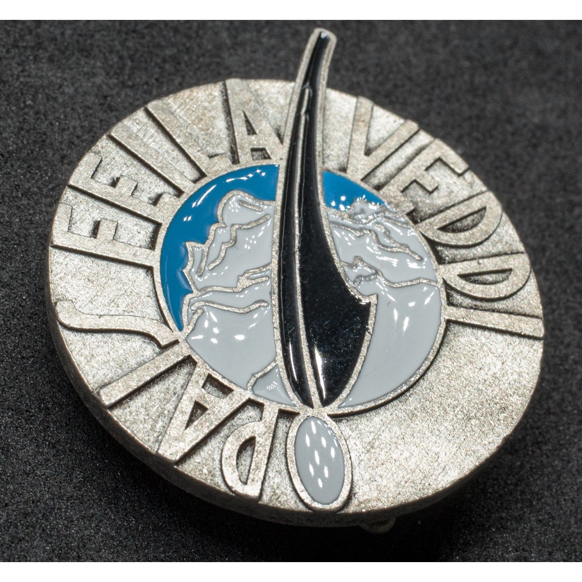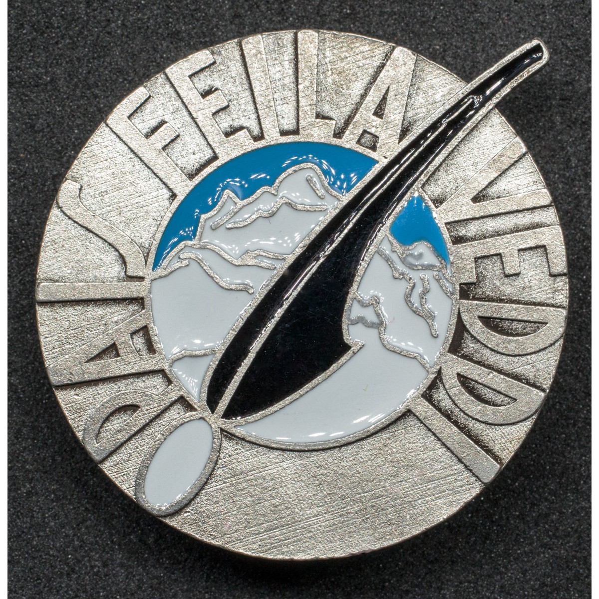 Rundes Truppenabzeichen, zugeschrieben der 12. Alpini-Kompanie des Bataillons „Intra“, einer Einheit, deren Tradition auf das im Jahr 1909 aus dem vorherigen Bataillon „Pallanza“ hervorgegangene Bataillon „Intra“ zurückgeht. Im inneren Medaillon ist der Monte Corchia dargestellt; auf dem äußeren Ring befindet sich das im Dialekt gehaltene Motto „Pais Feila Veudi“, das sinngemäß mit „Jungs, zeigt es ihnen!“ wiedergegeben wird. Den oberen Abschluss bildet die typische schwarze Alpini-Feder mit Quaste, eines der bekanntesten Kennzeichen der italienischen Gebirgstruppen.