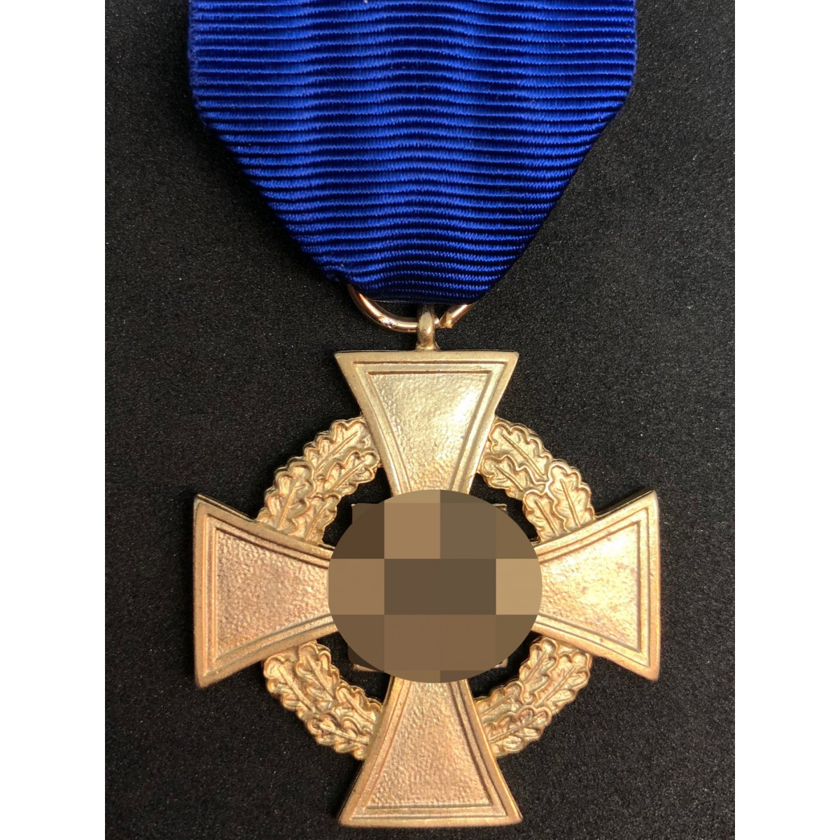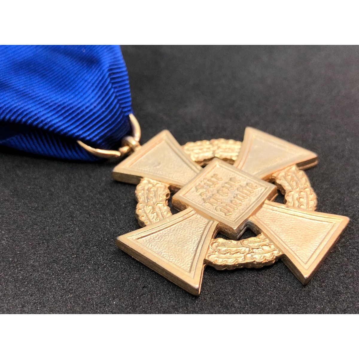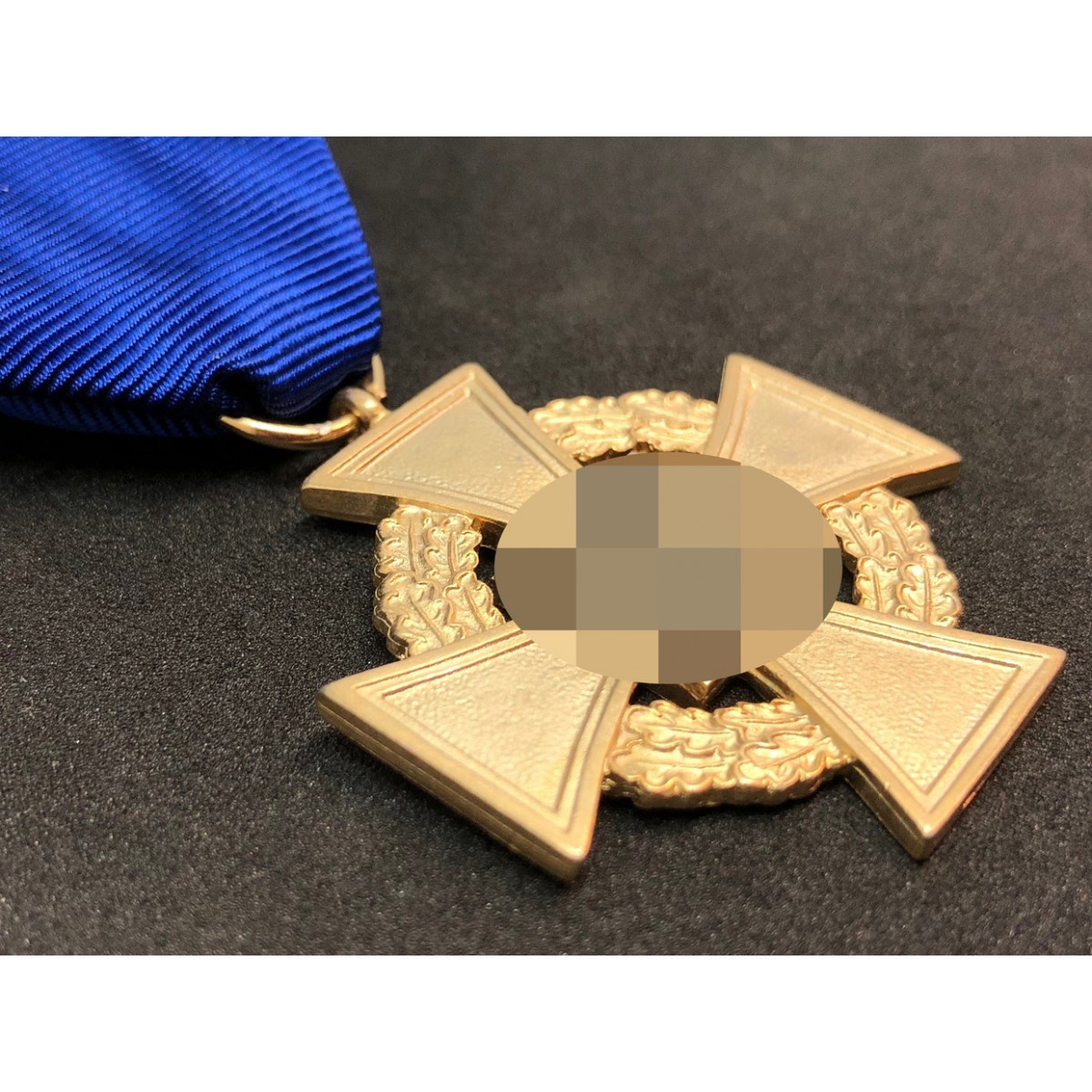 The first class award was for 40 years of service was a gold cross, with a gold wreath and a black enameled swastika in the center of the cross.