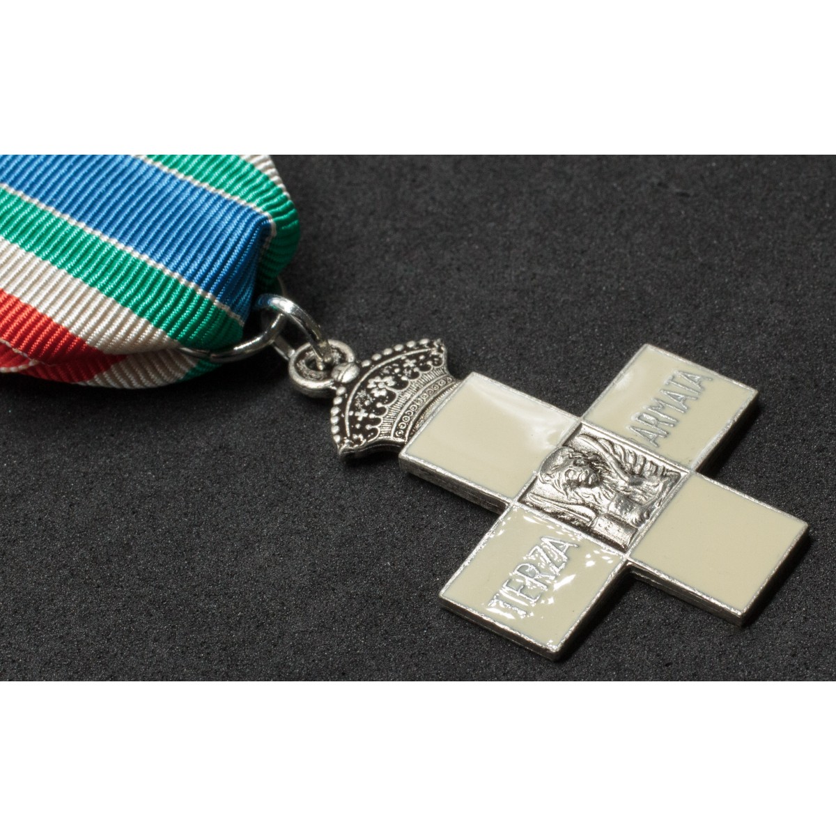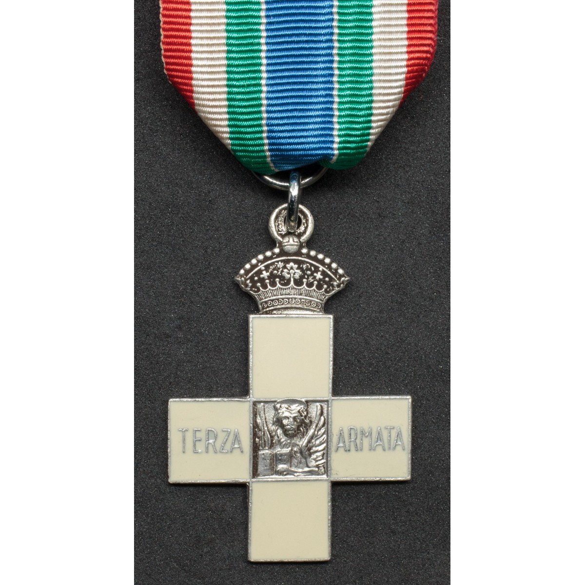 Inoffizielles Erinnerungskreuz der 3. italienischen Armee, nach 1918 geschaffen. Vergoldete Bronze mit weiß emaillierten Kreuzarmen, im Zentrum der Löwe von San Marco mit offenem Buch und der Inschrift „A ricordo e riconoscenza“. Gewidmet den Veteranen der „Unbesiegten Armee“.