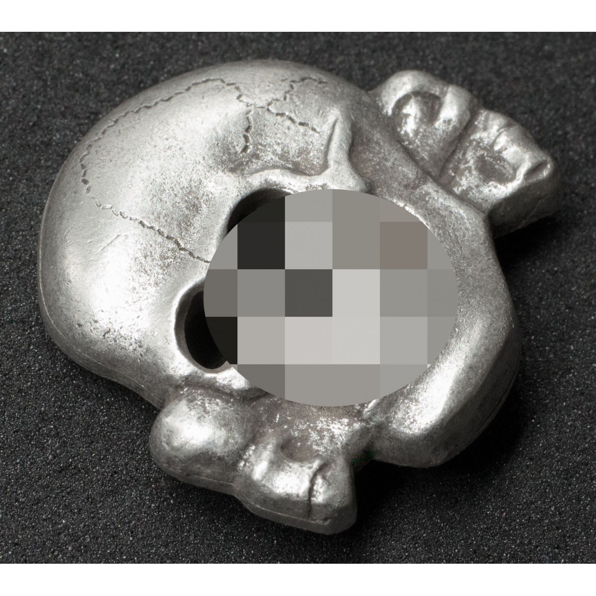 Totenkopf-Abzeichen für die Schirmmütze der Waffen-SS; gefertigt in Cupal, Aluminium oder später Zinklegierungen, meist silberplattiert. Häufige RZM-Kennzeichnungen: M1/52, 499/41. Befestigt durch Stifte/Laschen auf dem Stirnband der Mütze.