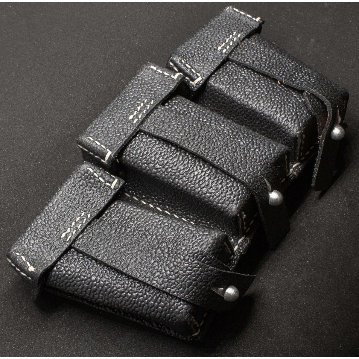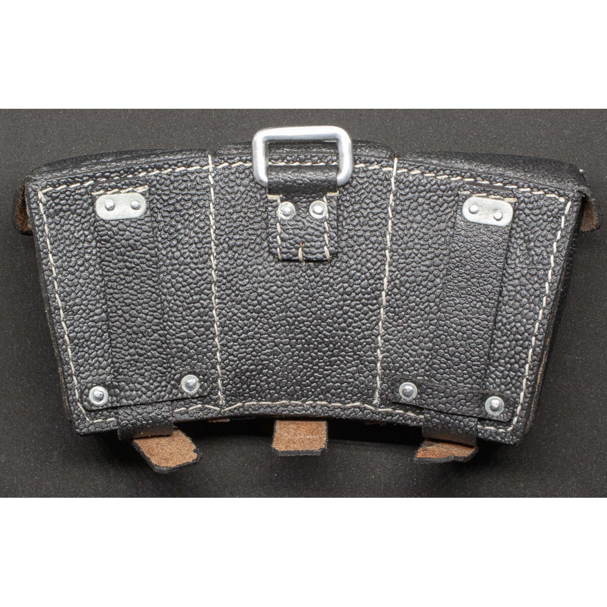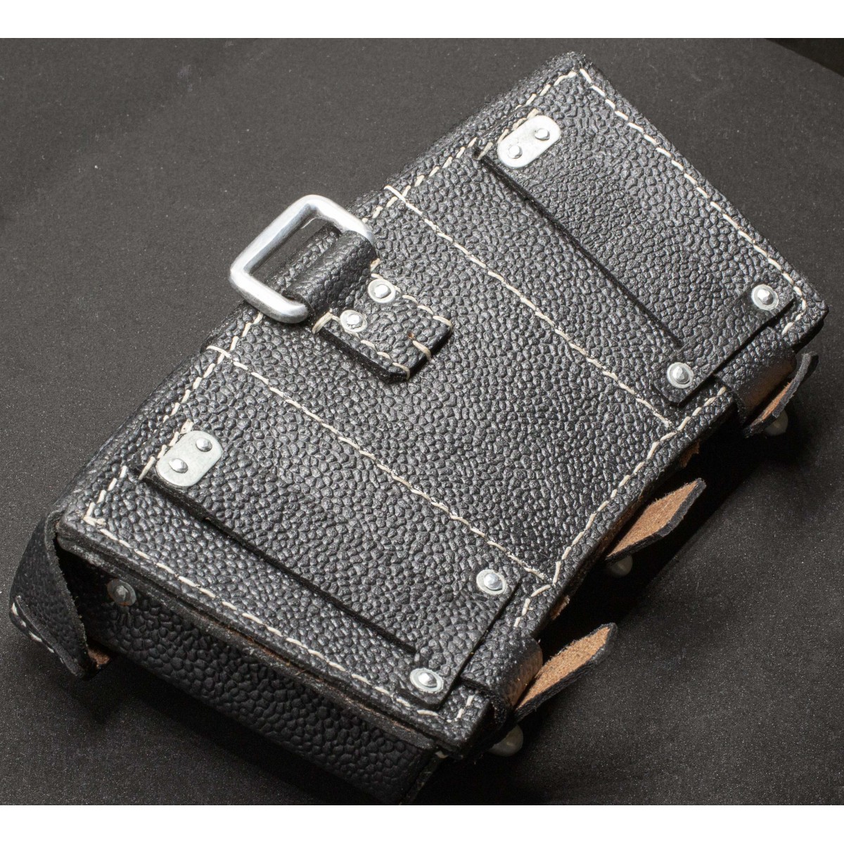 Gegenstand: Schwarze Lederpatronentasche mit stabilen Nähten und Metallbeschlägen. Drei Fächer, jedes für einen 5-Schuss-Patronenstreifen des Kar98k, insgesamt 15 Patronen pro Tasche.