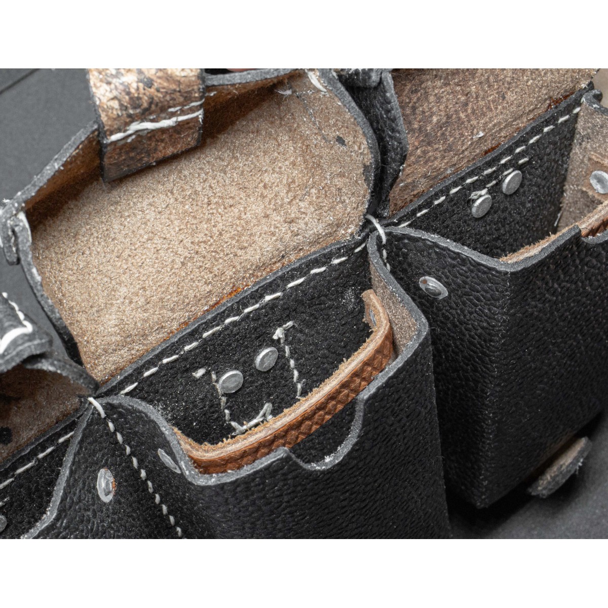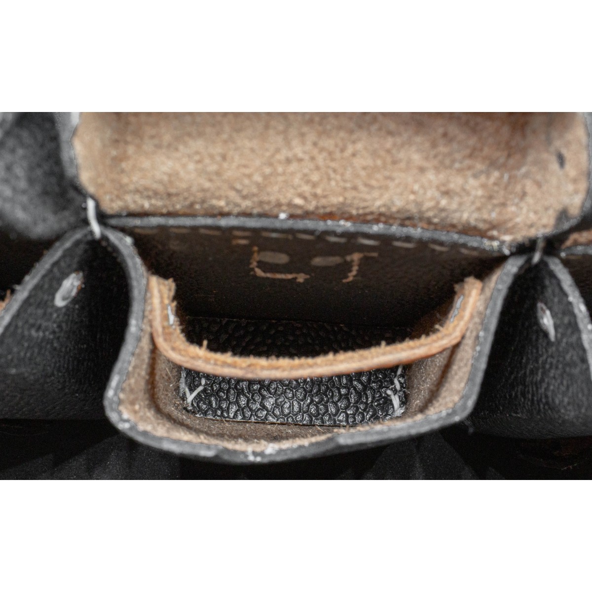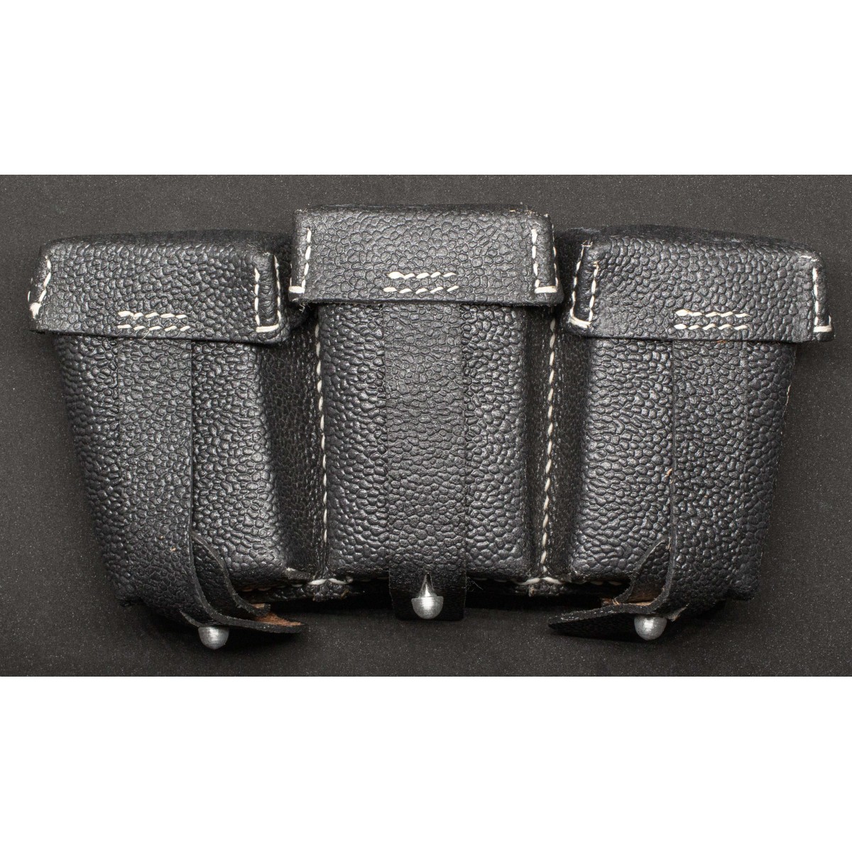 Gegenstand: Schwarze Lederpatronentasche mit stabilen Nähten und Metallbeschlägen. Drei Fächer, jedes für einen 5-Schuss-Patronenstreifen des Kar98k, insgesamt 15 Patronen pro Tasche.