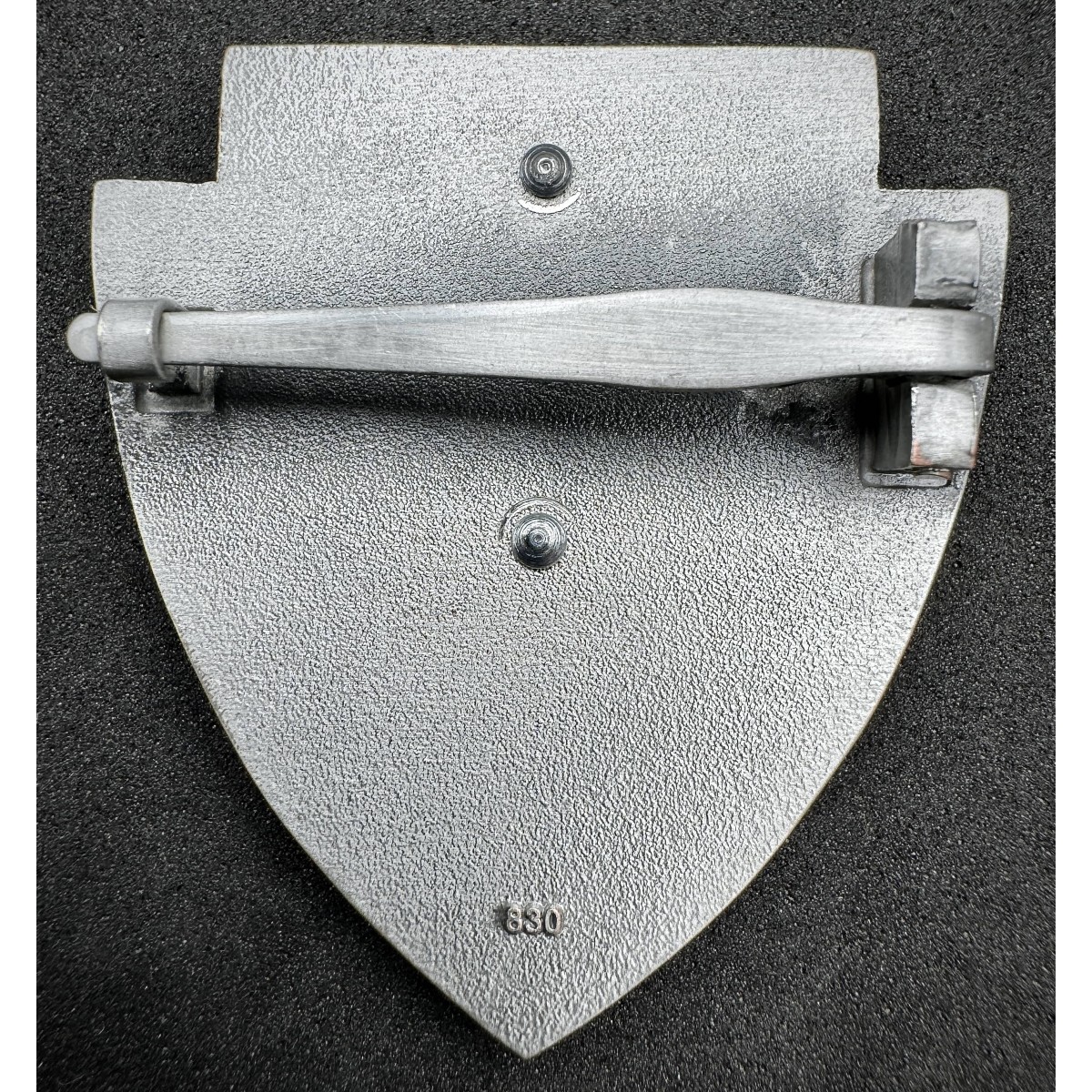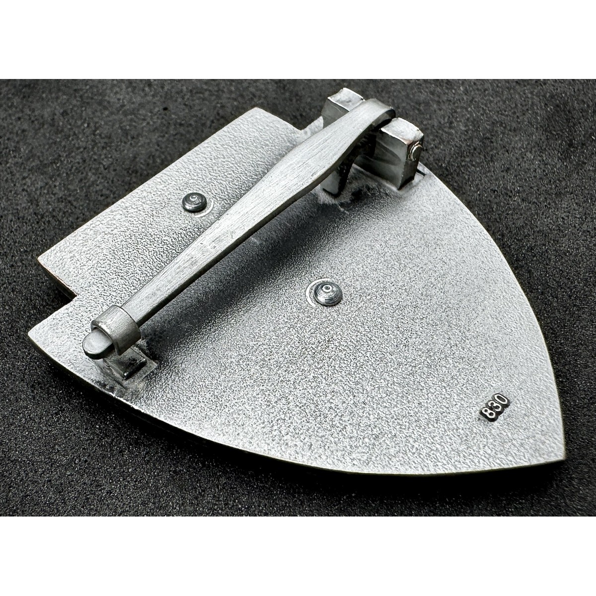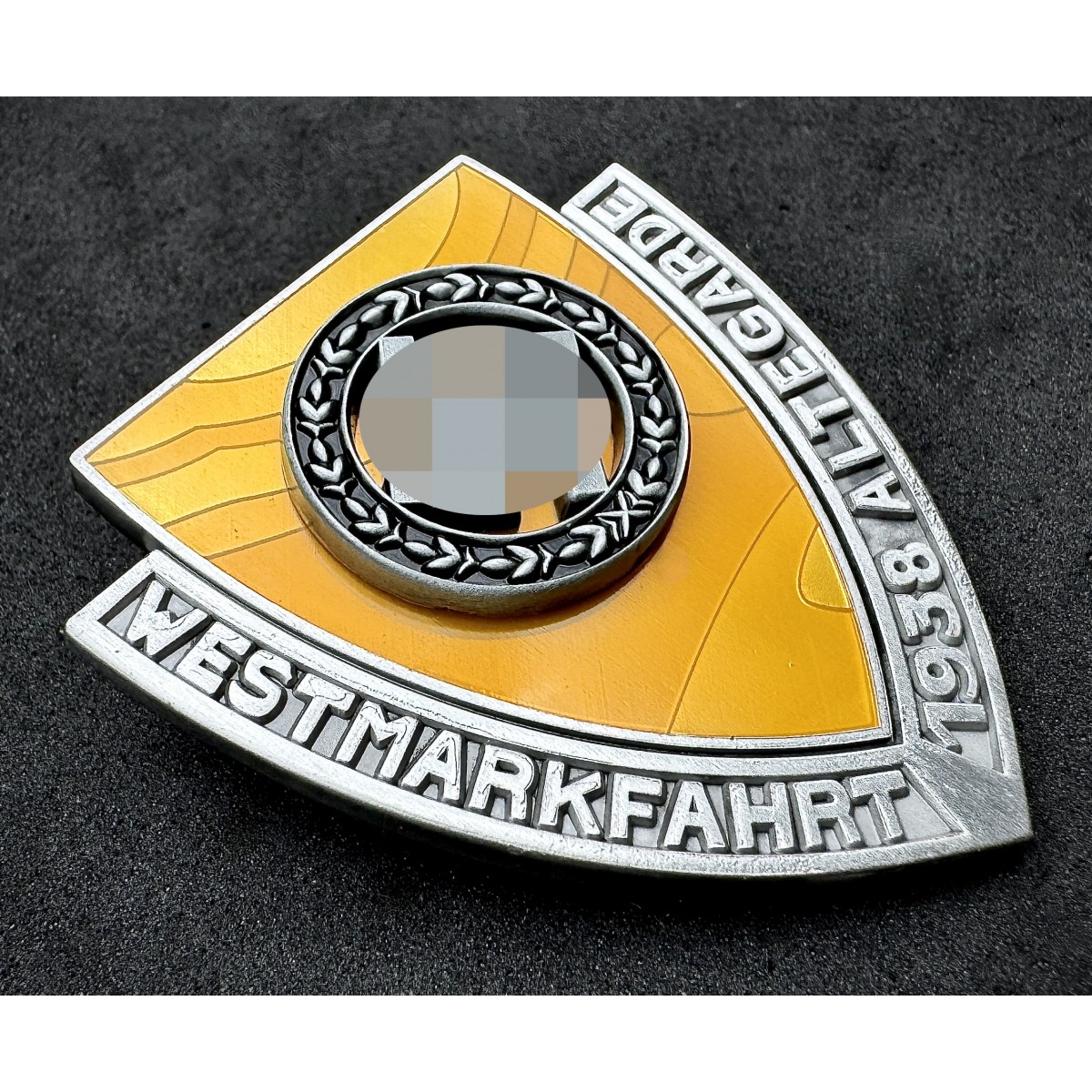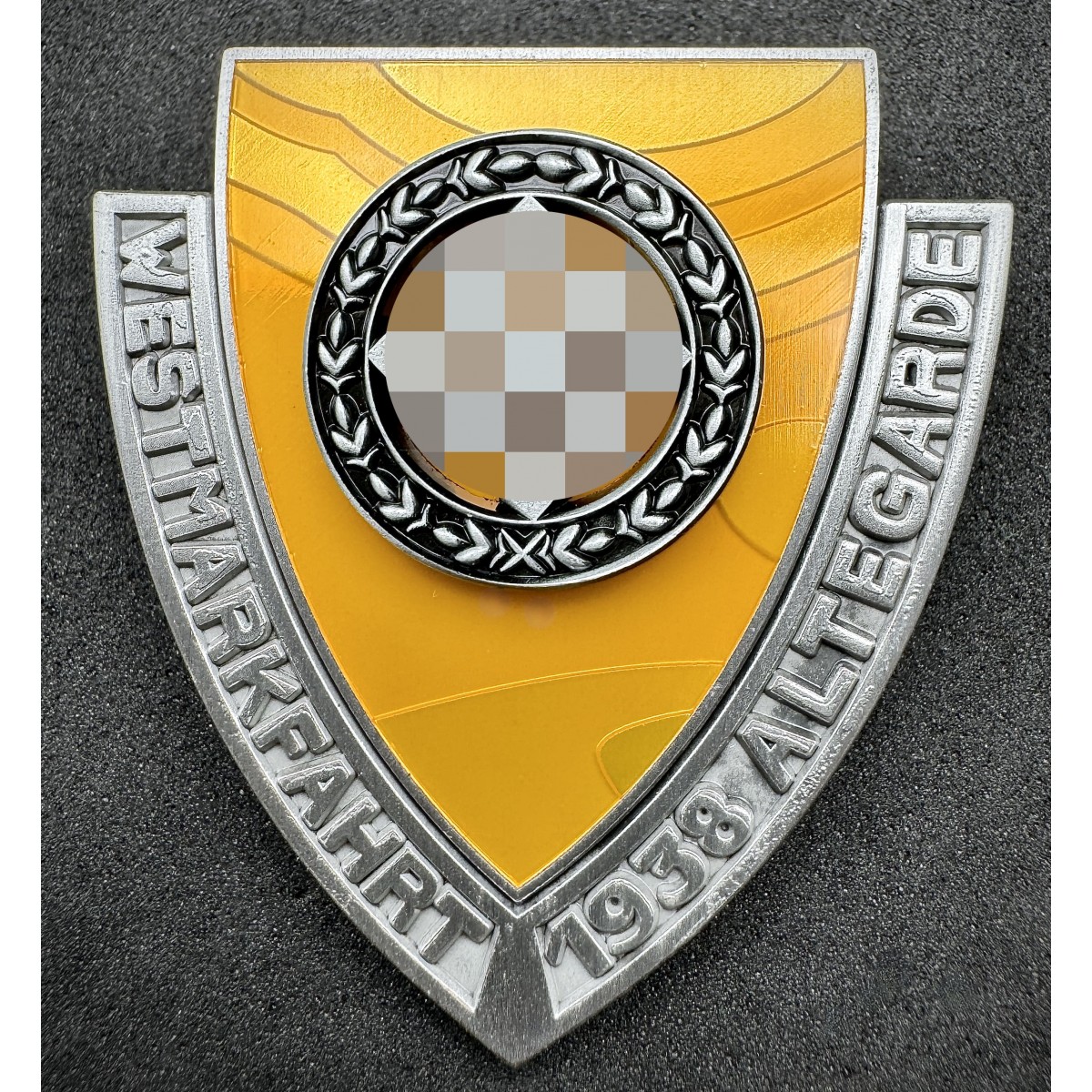 Ein silbergerahmtes Achatabzeichen mit Reliefaufschrift auf der Lünette: „Westmarkfahrt 1938 Alte Garde“. Die Lünette umgibt ein Stück gestreiften braunen Achat mit einem aufgesetzten silbernen Hakenkreuz. Die Rückseite trägt eine Befestigungsnadel und den Reinheitsstempel „830“.