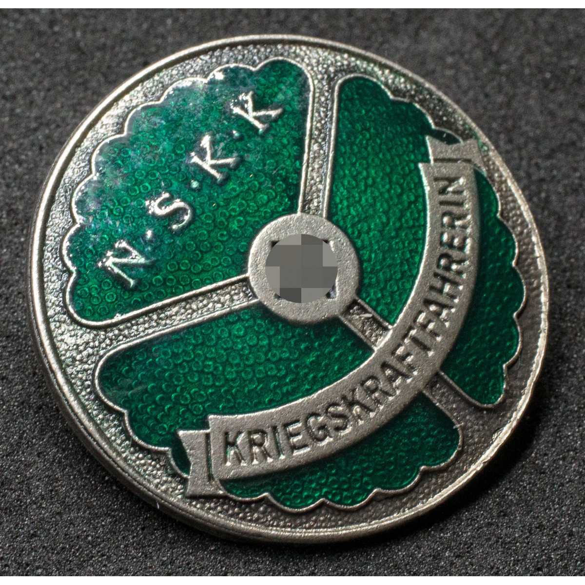 Ein konvexes Abzeichen mit 28 mm Durchmesser und aufgemalten Details. Die Vorderseite hat die Form eines Lenkrads mit einem eingekreisten Hakenkreuz in der Mitte und „N.S.K.K.“ darüber. Darunter ist „Kriegskraftfahrerin“ eingraviert (das Suffix „-in“ weist darauf hin, dass es sich um eine Frau handelt).