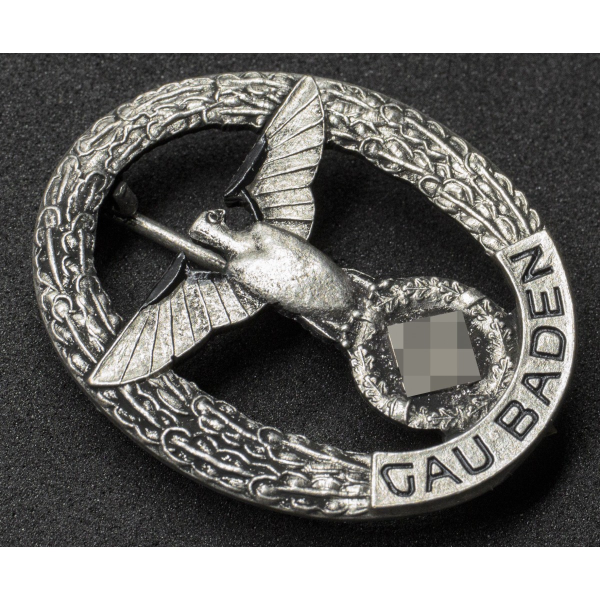 Gau-Ehrenzeichen Baden — Gestiftet 1933 durch den Gauleiter Robert Wagner im Gau Baden der NSDAP. In Silber verliehen an Mitglieder, die vor dem 27. Oktober 1927 beitraten; in Gold an Mitglieder vor dem 9. November 1923. Hergestellt aus versilbertem bzw. vergoldetem Metall, mit Herstellerpunze „Fr. Klett Karlsruhe“.