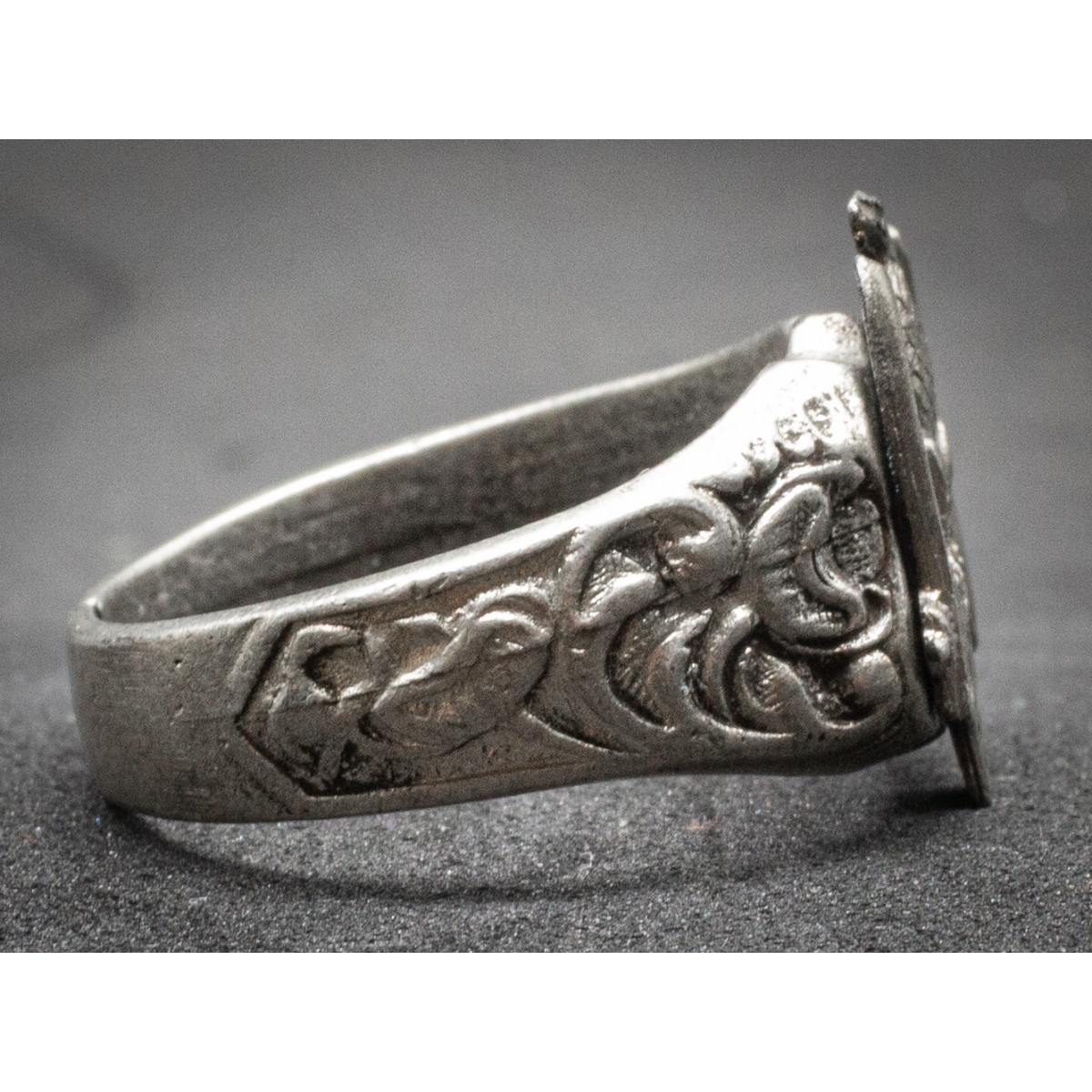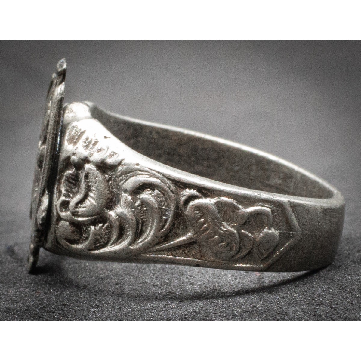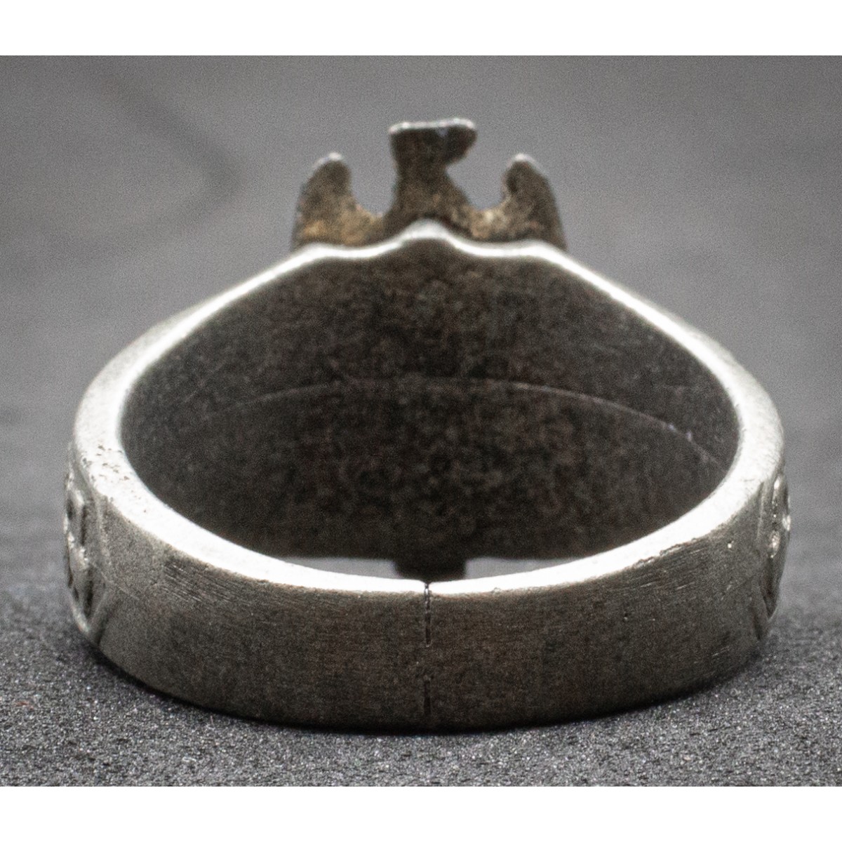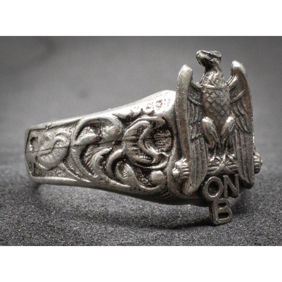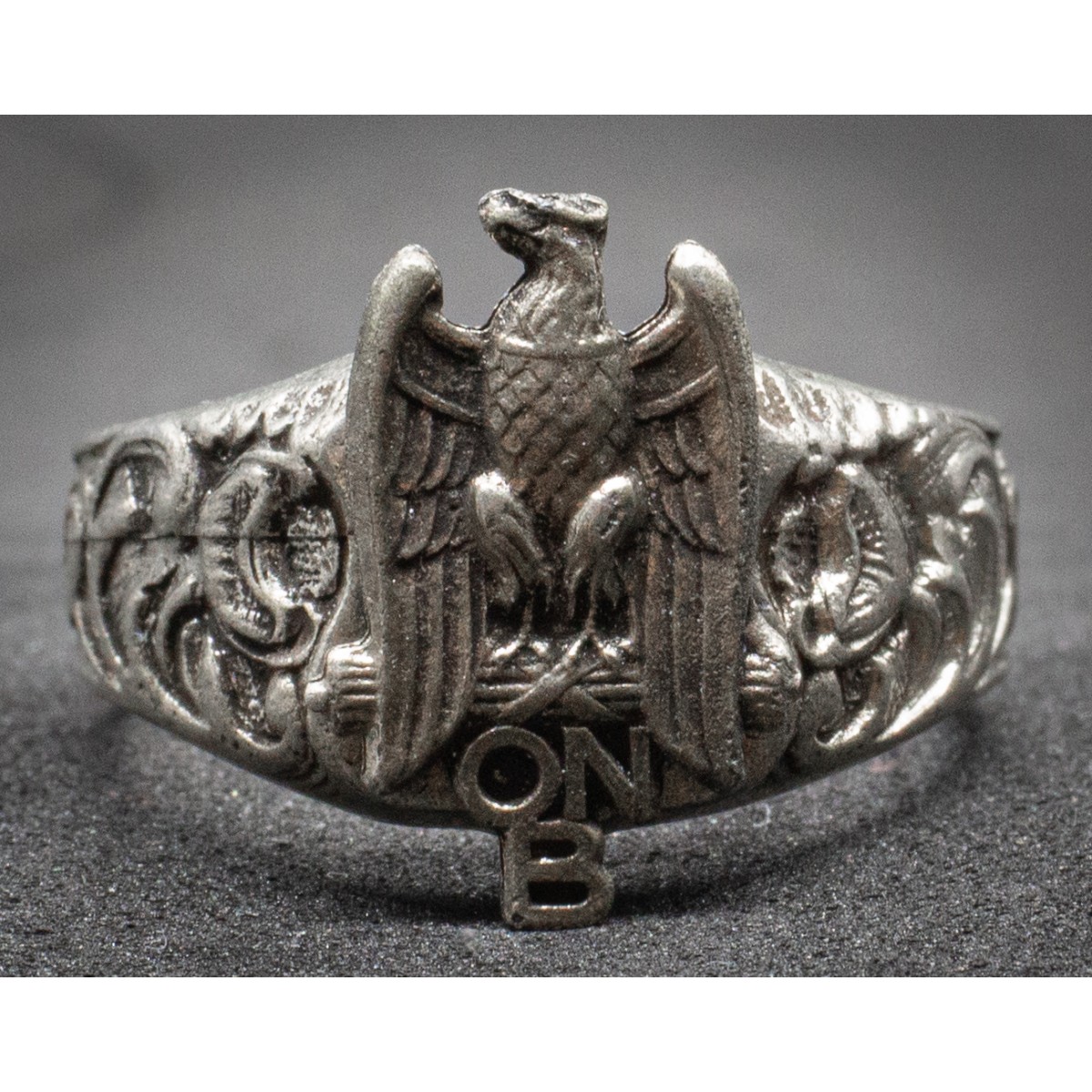 Gegenstand: Metallring, inoffizielles Modell, verziert mit Adler, Liktorenbündel und Kürzel „ONB“. Keine staatliche Ausgabe, sondern privat gefertigtes Zugehörigkeitsabzeichen.