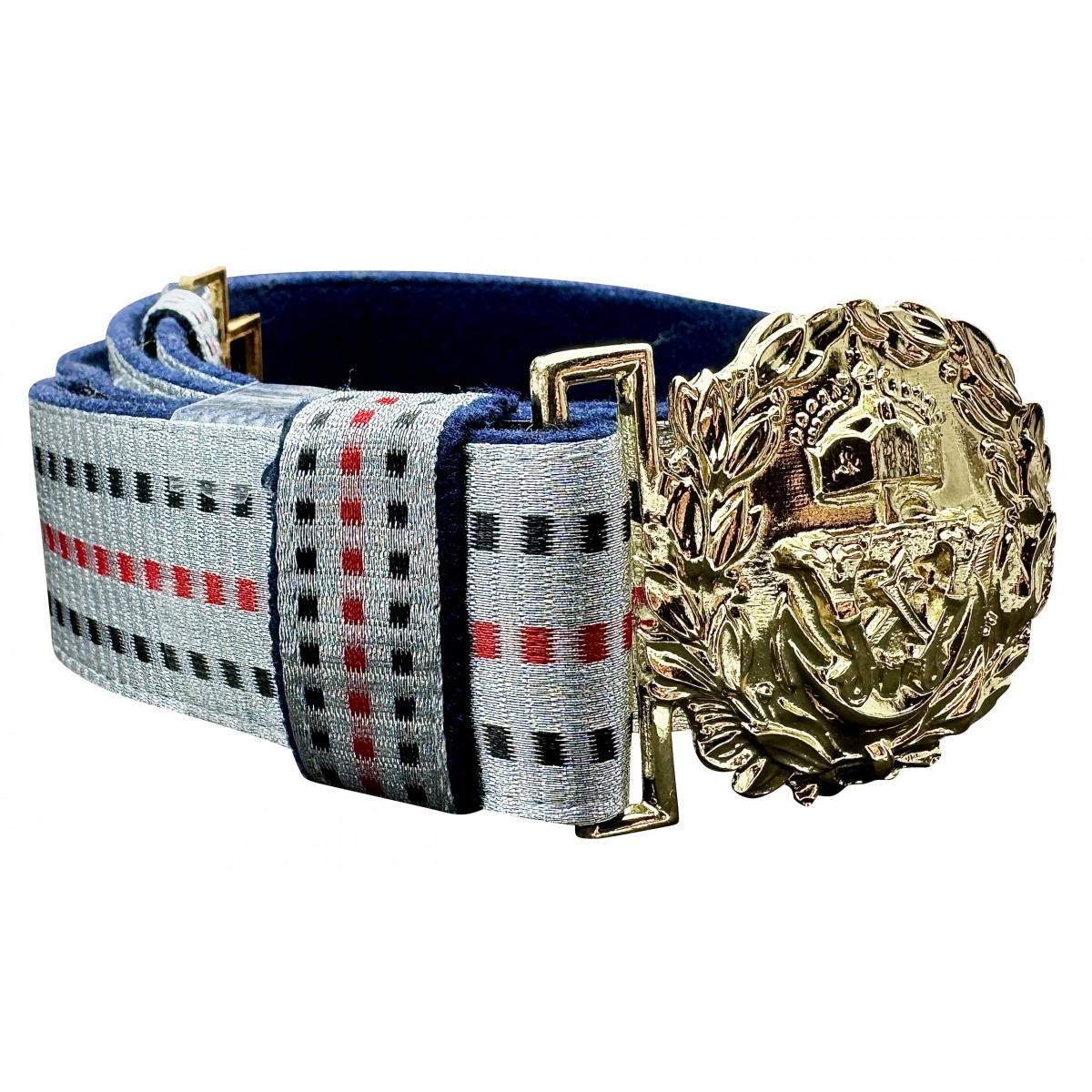 The brocade style belt is made from a silver bullion wire with red and black detailing, all backed onto a soft navy blue wool