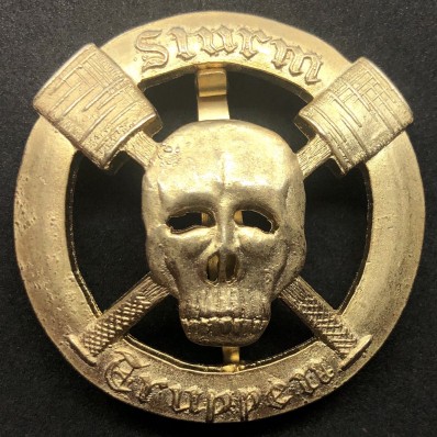 A variety of unofficial badges were worn by members of the elite German Stormtroop or 'Sturmtruppen' units that were established during WWI. The designs nearly always featured the iconic German stick grenade, the famous stahlhelm and the death's head.