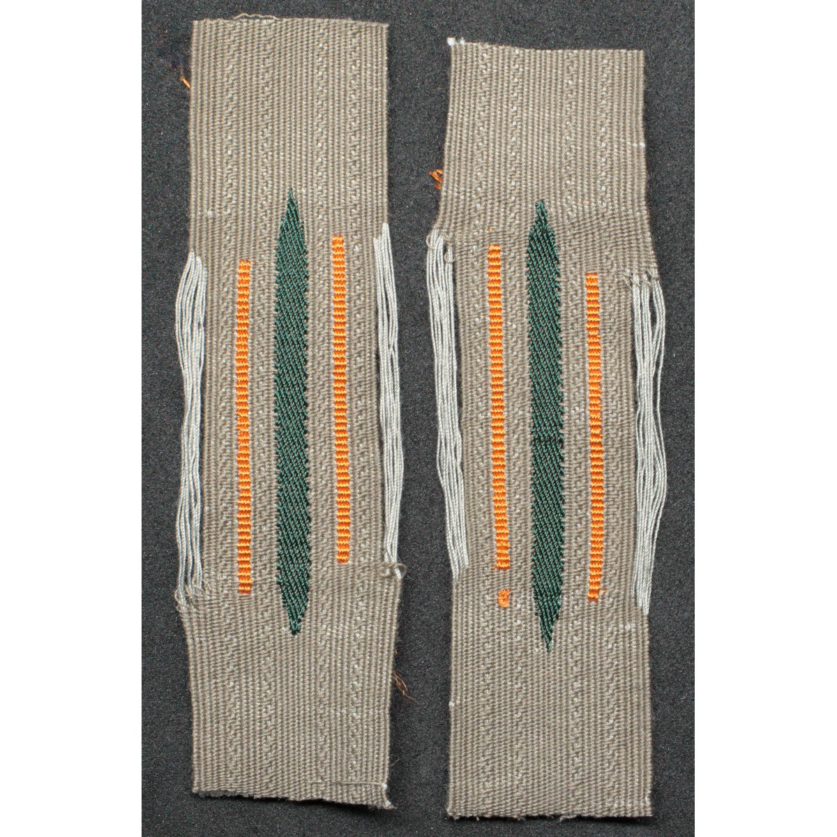Typically the tabs consisted of a feldgrau cloth base with the Litzen pattern woven in light grey or silver thread, mounted on a backing displaying the orange Waffenfarbe.