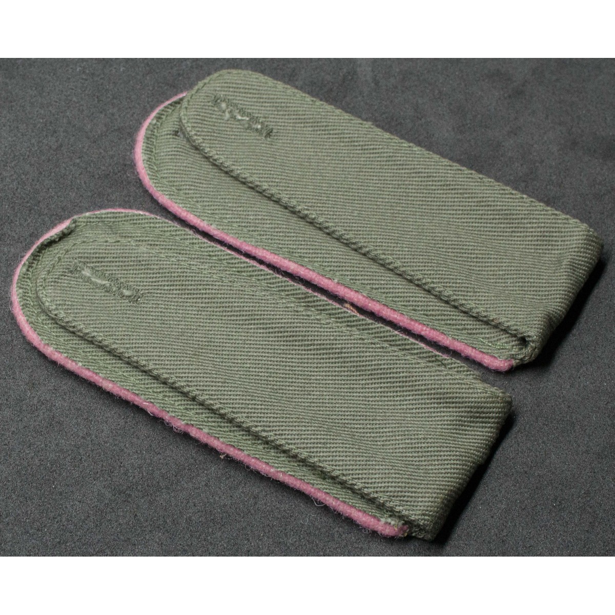 Pair of shoulder boards for Enlisted Men (EM) of the Panzer troops of the Deutsches Afrika Korps (DAK). Made of tropical cloth with pink piping, the branch color of German armored units. Intended for tropical uniforms worn in North Africa during the 1941–1943 campaign.