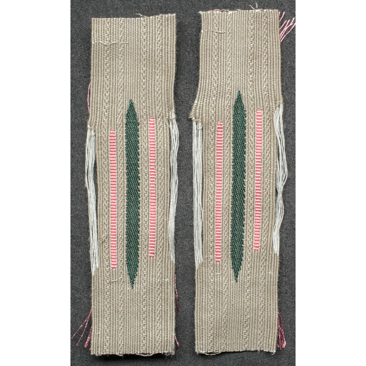 Pair of BeVo woven “Litzen” collar tabs for the Panzer troops of the German Wehrmacht. Featuring pink Waffenfarbe, the traditional branch color of German armored units. Intended for field tunics and service uniforms, identifying personnel of Panzer formations.