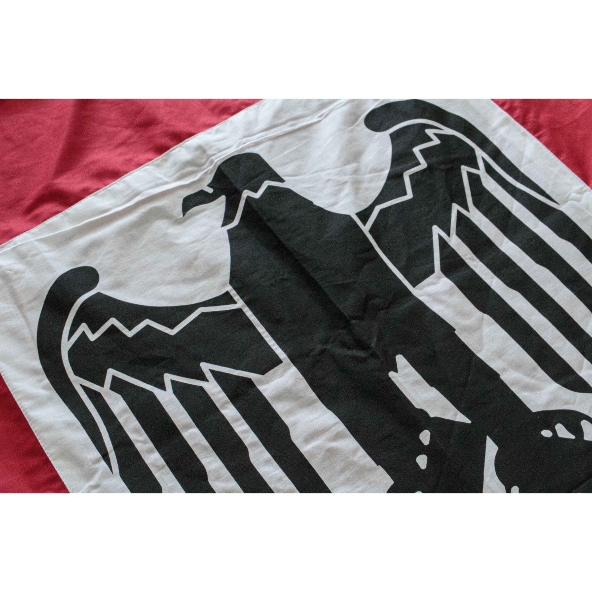 The NSDAP podium flag was a ceremonial drape used on lecterns, stages, and reviewing stands during official party events from 1933 to 1945. Typically produced as a vertical textile banner with the party emblem centered, it provided immediate visual identification of the authority represented at public gatherings. Construction involved cloth fields with appliqué or embroidered insignia, secured to the front of podiums or arranged in multiples to form a uniform backdrop. This specific podium-flag format is also shown in early scenes of the film American History X as a period-appropriate prop, reflecting the documented visual language of ceremonial stage decoration of the era.