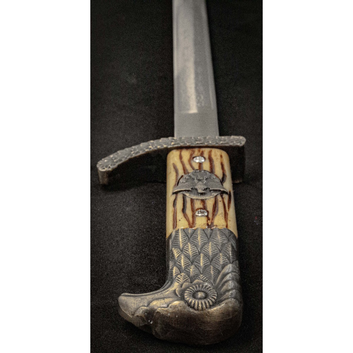 The crossguard, scabbard bands and chape are finished in bronze, while the scabbard body is predominantly black. The straight blade is embellished with floral etched motifs and bears no ideological motto or inscription, distinguishing it from the regulation SS dagger engraved with “Meine Ehre heißt Treue.”