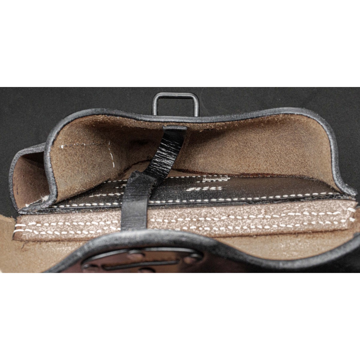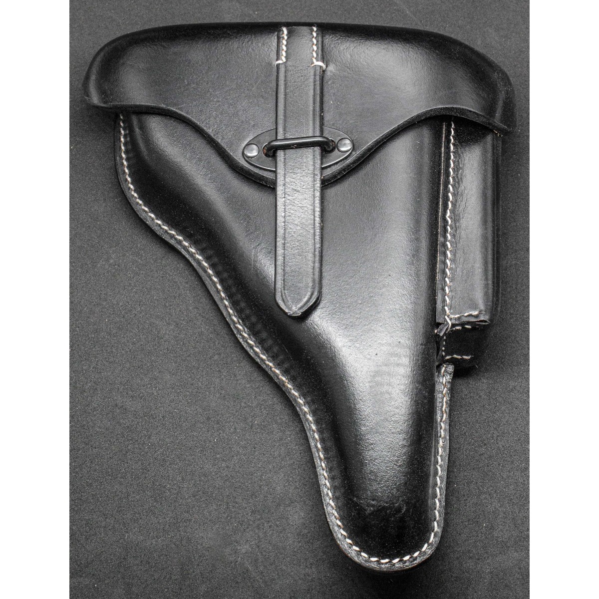 Rigid (“hard shell”) holster for the Walther P38 in black leather, specifically developed to accommodate the Walther P38, adopted in 1938 as the standard sidearm of the German armed forces, replacing the earlier Luger P08 in large-scale production. The holster is constructed using thick, form-molded leather, shaped to create a rigid protective shell that shields the pistol from mechanical damage, dirt, and environmental exposure.