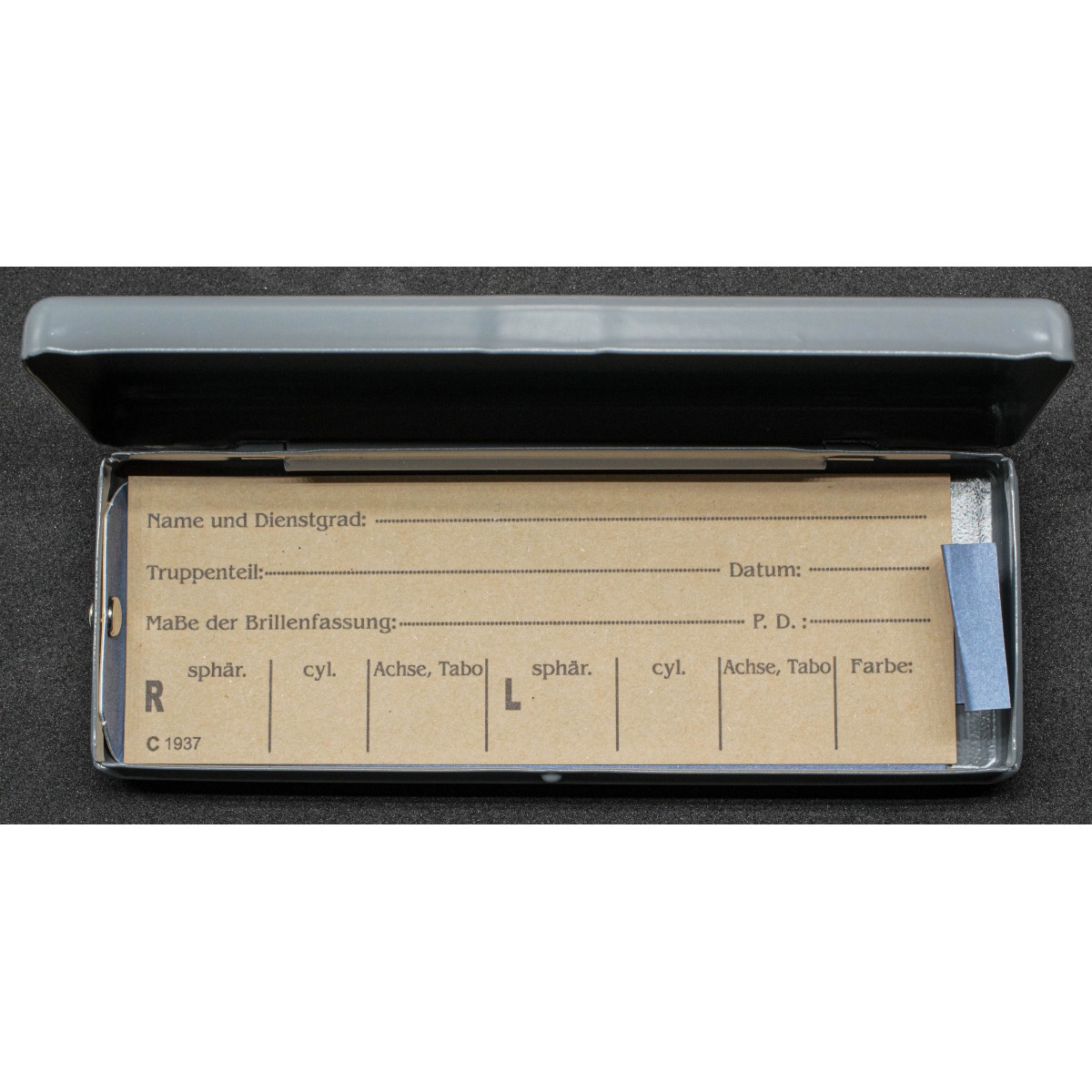 WWII German Dienstbrille with case, issued service eyeglasses for soldiers requiring vision correction. Featuring a metal frame, protective case, and internal card with the soldier’s personal details. A standard piece of individually assigned military equipment.