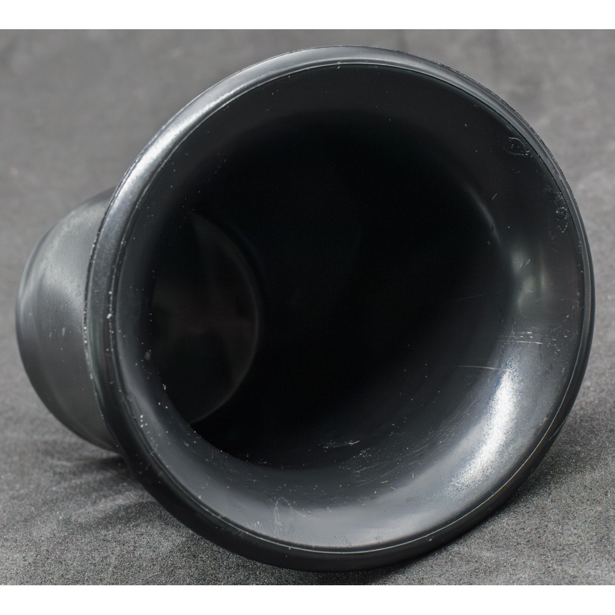 Standard Trinkbecher for the German M31 canteen. Made in black bakelite/plastic, it was designed to fit over the base of the Feldflasche 31. This wartime version replaced earlier aluminum cups as Germany shifted strategic metals to more essential military uses, making it a characteristic component of WWII German field gear.