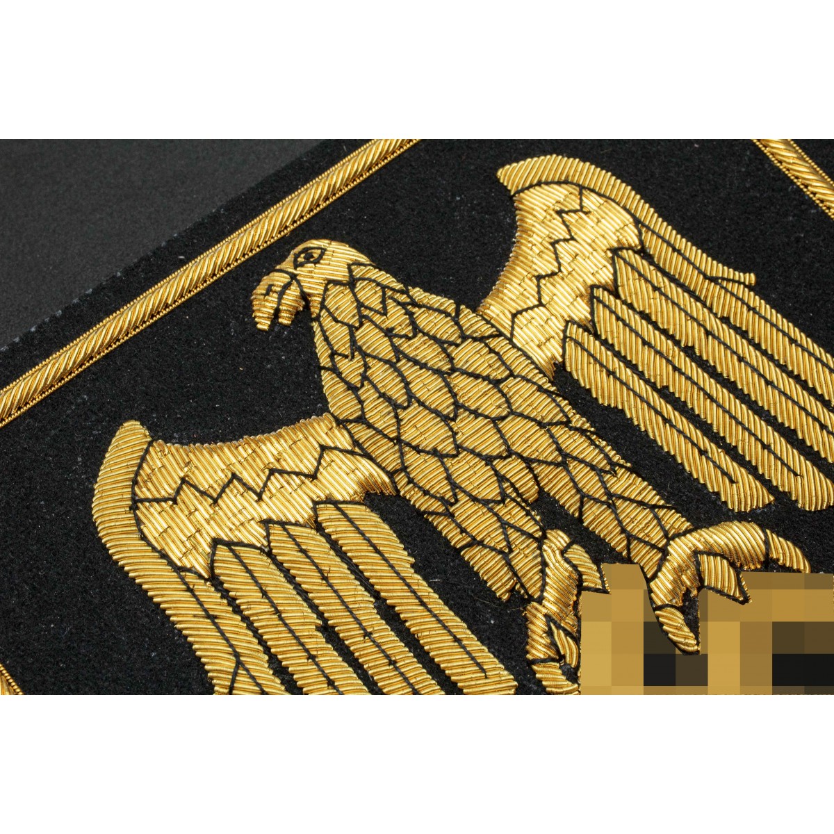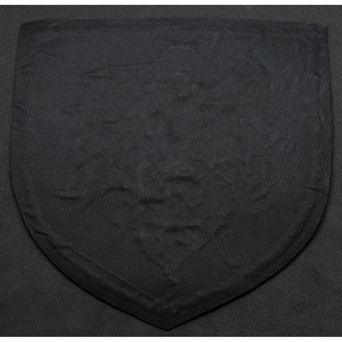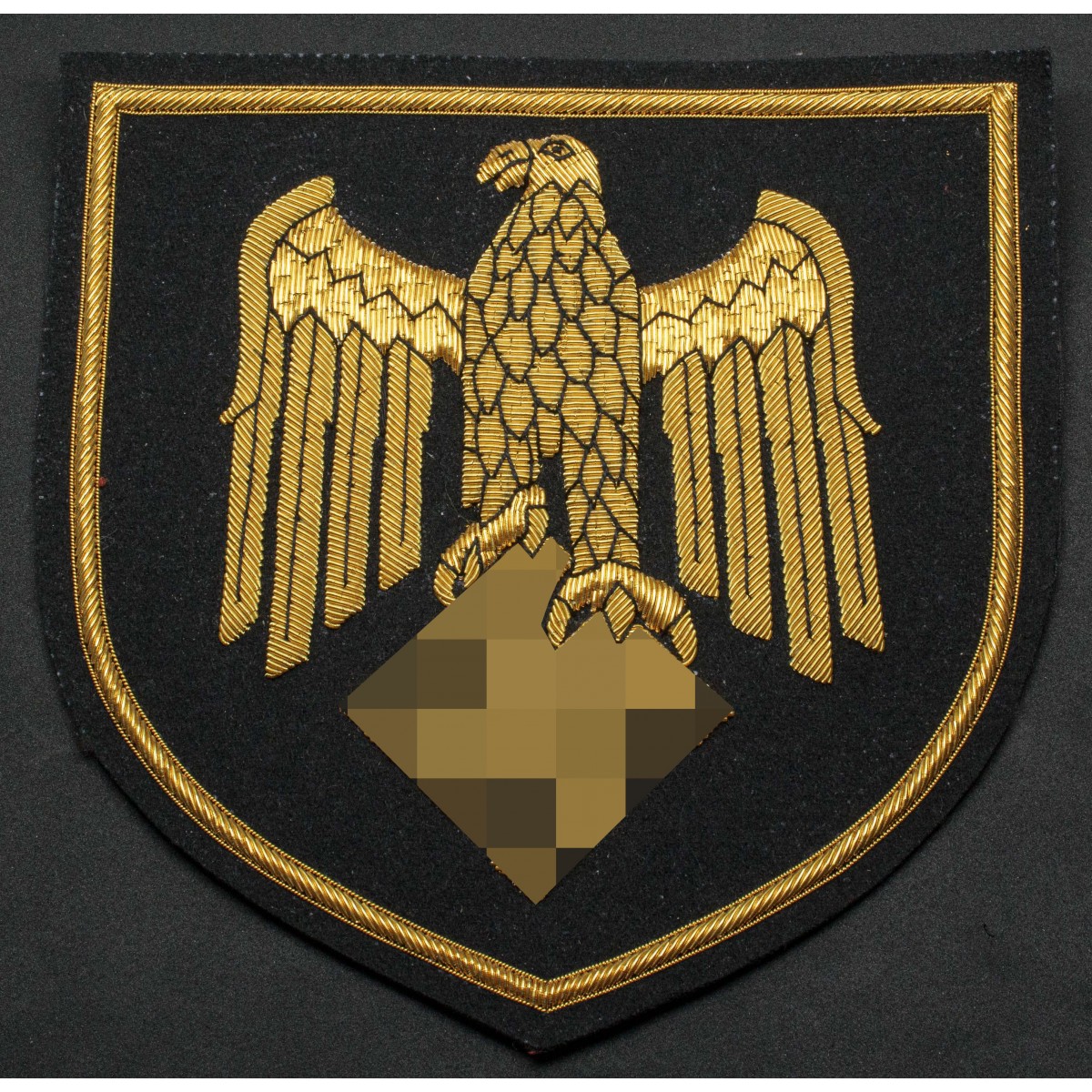 This shield-shaped embroidered flag incorporates the distinctive eagle emblem used by the Kriegsmarine, the naval arm of Nazi Germany’s armed forces from 1935 until the end of World War II. The eagle motif, executed in gold threadagainst a dark base, mirrored the principal national insignia of the German navy and served to visually communicate authority, status, and affiliation within the maritime service. Emblems of this type were common on uniforms, headgear, and flags; they embodied the strict visual language of military symbolism of the Third Reich era. The shield format echoes longstanding European heraldic traditions, while the gold embroidery denotes a ceremonial or official quality, often associated with higher-ranking units or prestigious uses. As an artifact, the flag reflects both the iconography and the organizational culture of the Kriegsmarine at the height of its operational history during the Second World War.