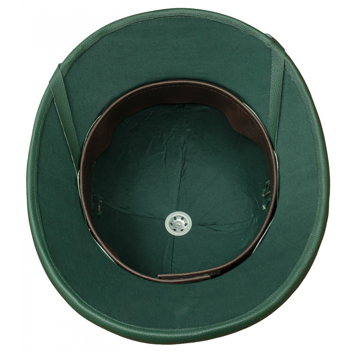 metal insignia is mounted on the front, serving as an identifying feature, while a fabric band runs around the base of the crown. The brim edge is reinforced, often with synthetic or leather material, to enhance durability.