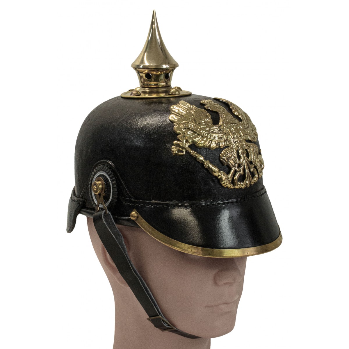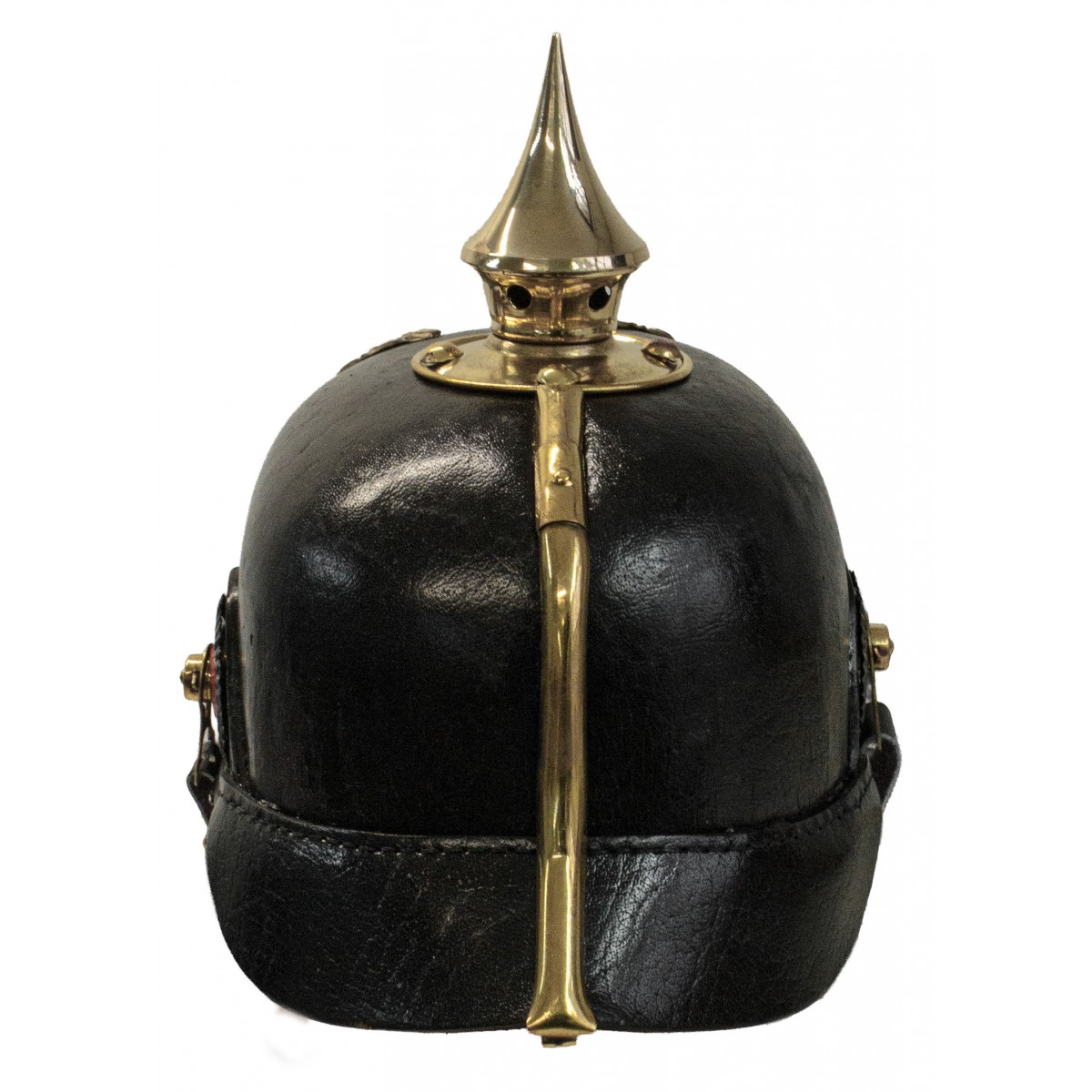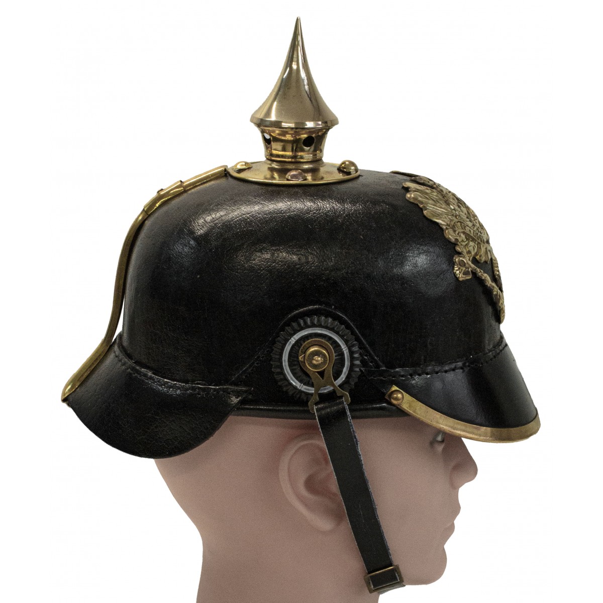 At the front is the Prussian eagle plate, while the sides feature cockades positioned at the chinstrap mountings. The helmet is completed with metal fittings, a leather chinstrap, and an internal leather liner, designed to provide stability and fit.