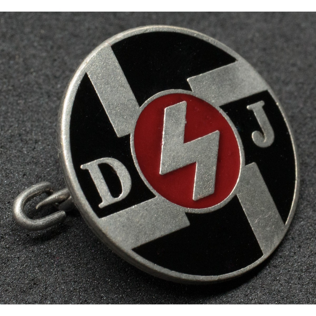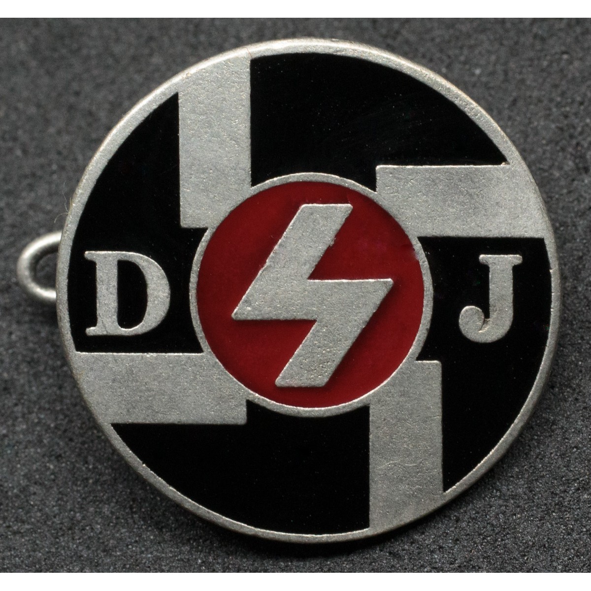This version features a circular design, setting it apart from the more common diamond-shaped badge. At the center appears a stylized lightning bolt, a symbol associated with energy, movement, and youthful vigor. Flanking the bolt are the letters “D” and “J”, standing for Deutsches Jungvolk. A swastika in the background reinforces the ideological framework within which the organization operated.