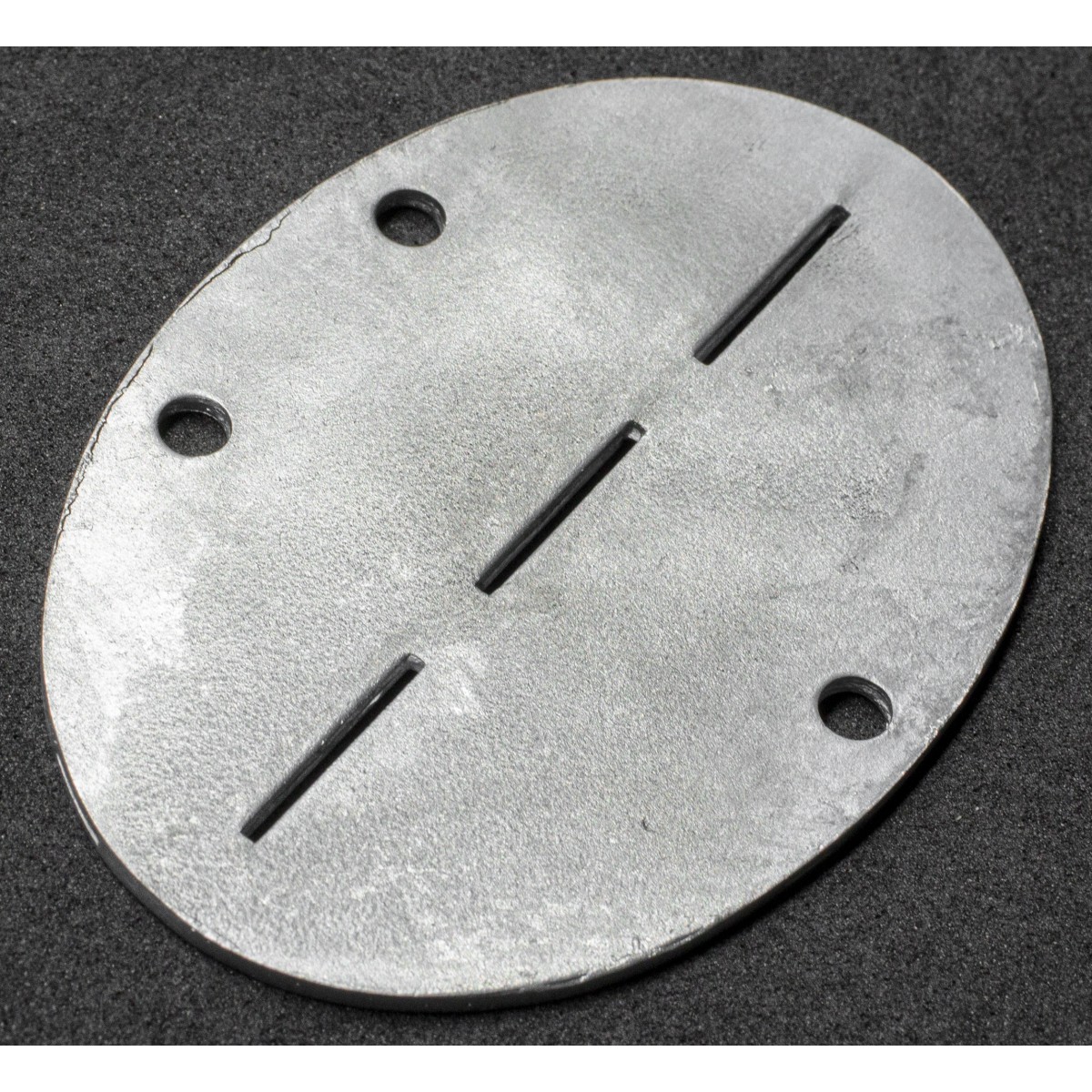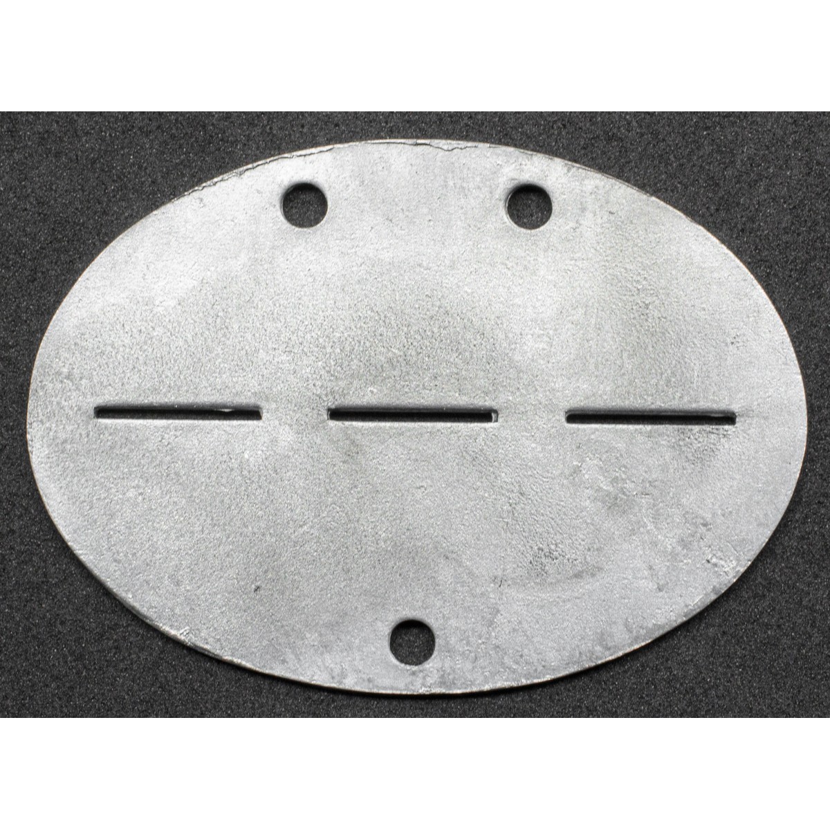 Standard German WWII identification tag in aluminum, made in the classic oval form with two upper holesone lower hole and three central slots. Intended for the engraved service details of the soldier, it was designed to be split into two matching halves when required by military identification procedures.