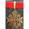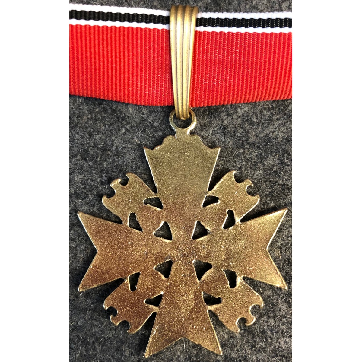 The sign of the Order consisted of a Maltese cross with a swastika dominated by the German eagle on every corner of his arms. For the military class, the order could be completed by adding two crossed swords to the back. The order ribbon was red with a white, black and white stripe on each side.