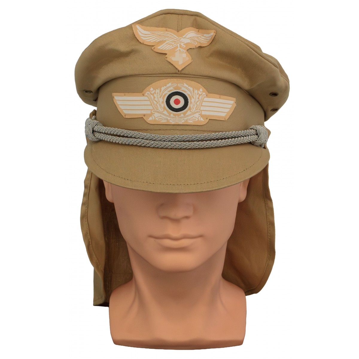 Copricapo tropicale da ufficiale della Luftwaffe, prodotto dalla ditta Hermann Meyer. Realizzato in tessuto chiaro per climi caldi, con visiera rigida e fregi regolamentari. Utilizzato nei teatri operativi mediterranei e nord-africani durante la Seconda Guerra Mondiale.