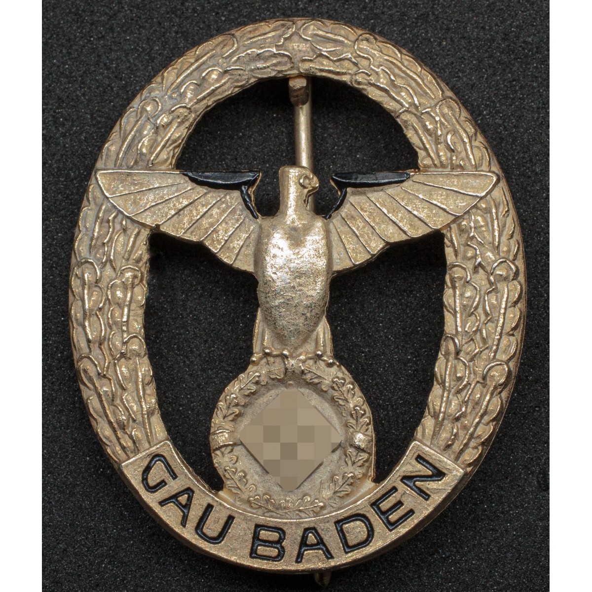 Distintivo d’onore del Gau Baden — Emesso dal Gau Baden della NSDAP come riconoscimento politico, nella versione in argento per chi era membro del partito prima del 27 ottobre 1927, e in oro per membri antecedenti al 9 novembre 1923. Realizzato in metallo argentato/ dorato, reca sul retro la dicitura “GAU BADEN” e spesso il marchio del produttore “Fr. Klett Karlsruhe”.