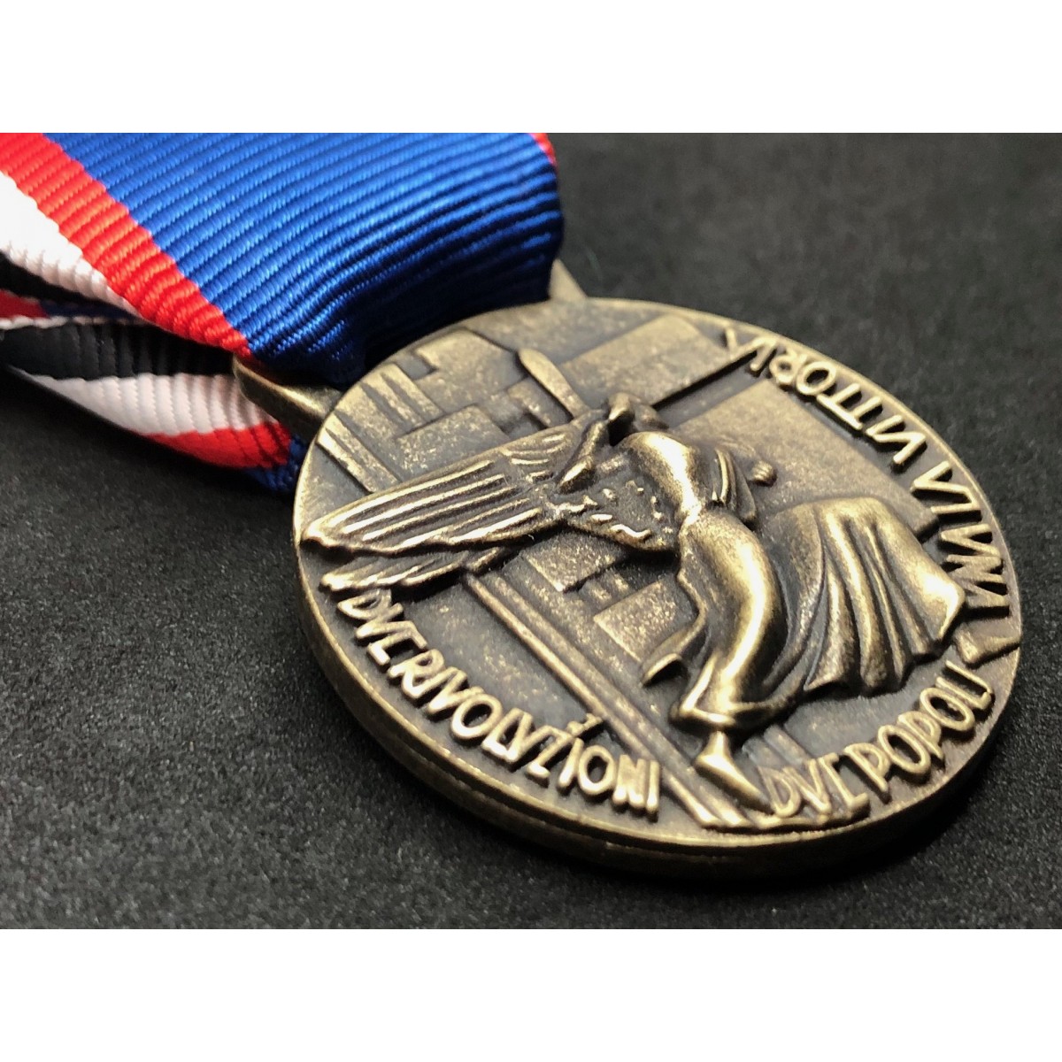The medal wanted to exalt the "Pact of Steel" between the allies Italy and Germany: on the front are in fact represented the busts of Mussolini and Hitler with helmets, turned to the right, superimposed, with the date "1941" and the signature of "B. Locatelli". All around, on the edge, runs the phrase "The war continues and will continue until victory". On the back is depicted a Victory with a sword in his right hand and a laurel wreath in his left hand, marching to the right with a swastika and a bundle in the background. On the edge runs the inscription in relief "Two revolutions two peoples one victory".