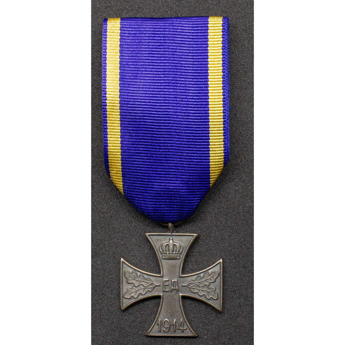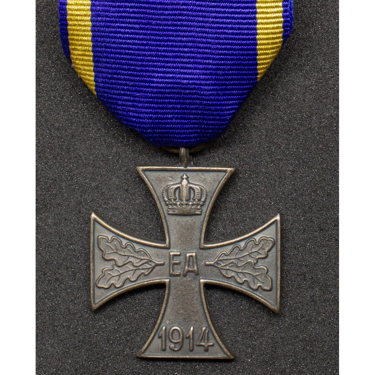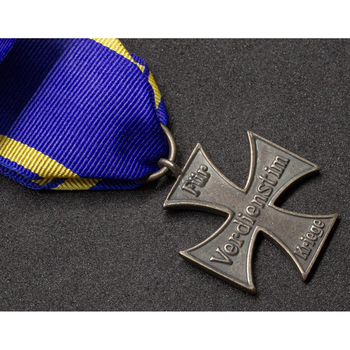 Riproduzione fedele della Croce al Merito di Guerra (2ª Classe), istituita nel 1914 dal Duca Ernst August di Brunswick. Realizzata in bronzo a forma di croce pattée, reca “EA” al centro, corona e data “1914”, con “Für Verdienst im Kriege” sul retro. Confezionata con nastro blu e giallo.
