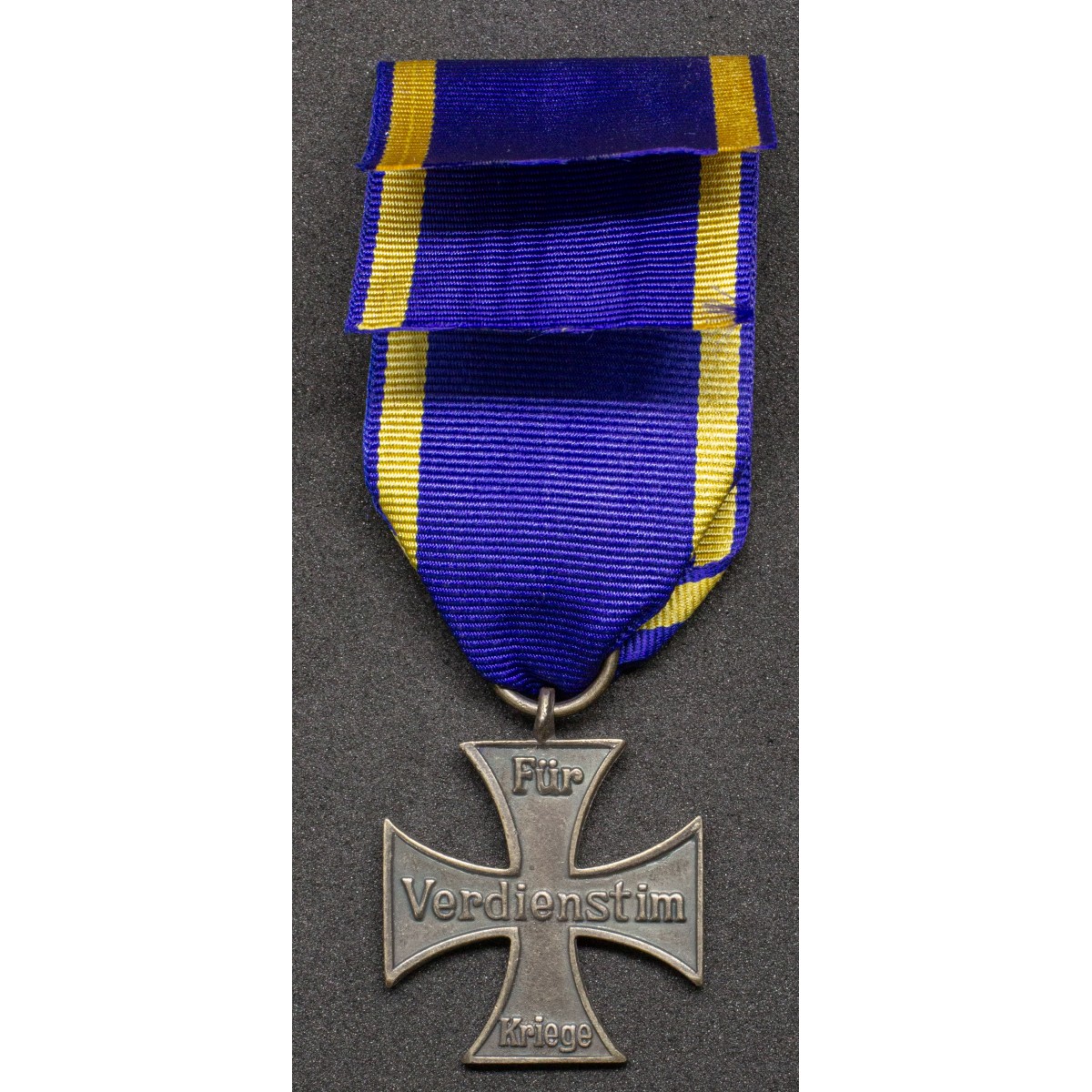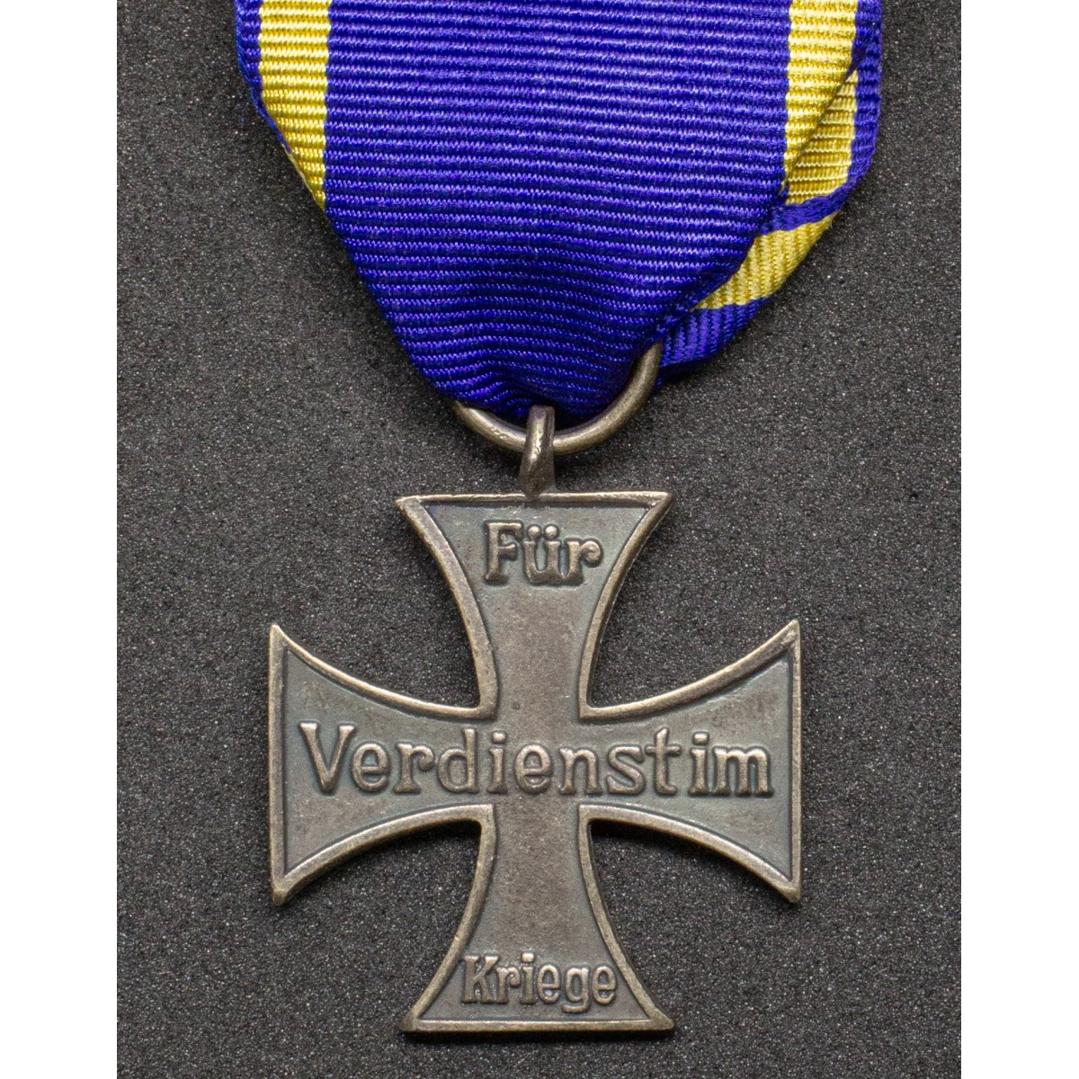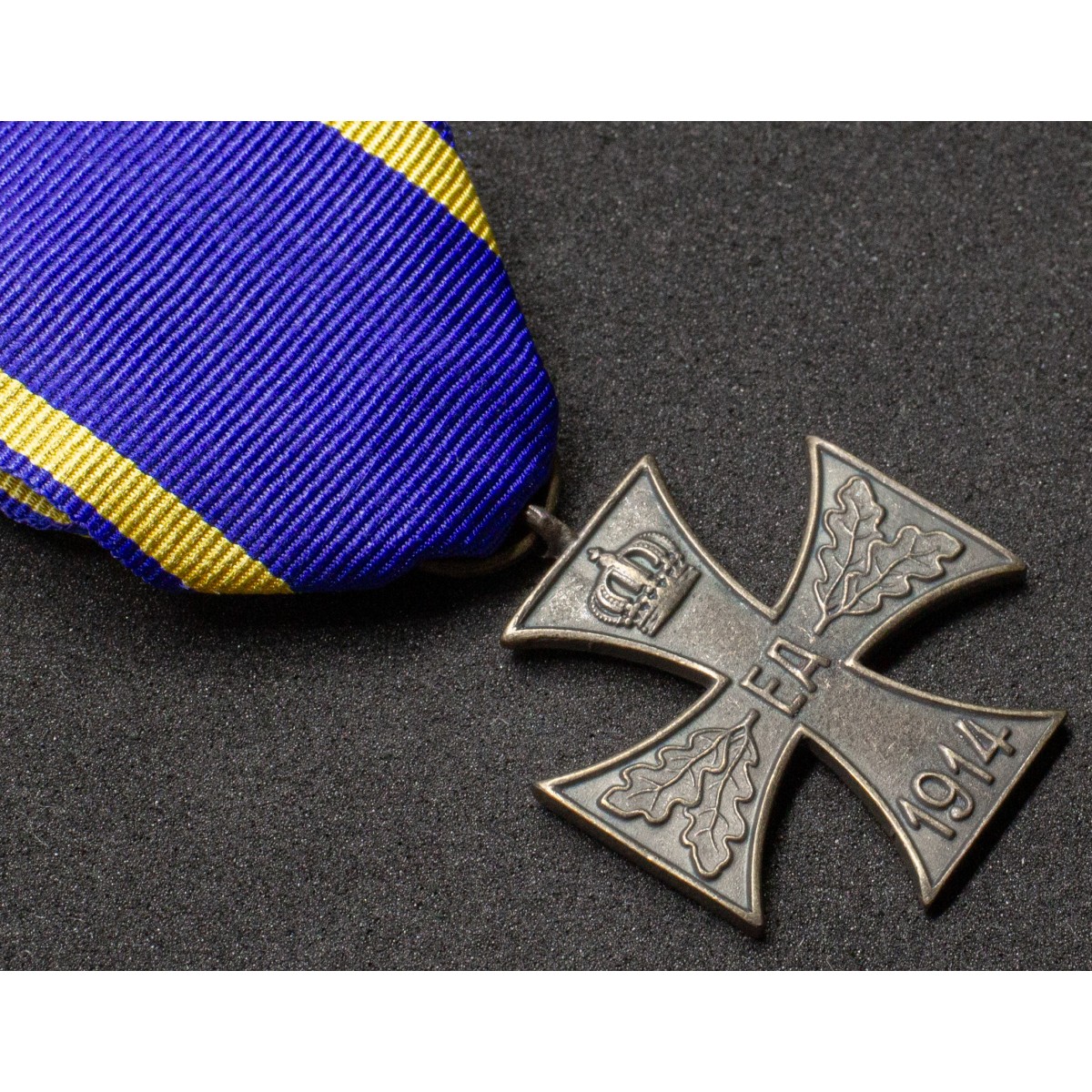 Riproduzione fedele della Croce al Merito di Guerra (2ª Classe), istituita nel 1914 dal Duca Ernst August di Brunswick. Realizzata in bronzo a forma di croce pattée, reca “EA” al centro, corona e data “1914”, con “Für Verdienst im Kriege” sul retro. Confezionata con nastro blu e giallo.