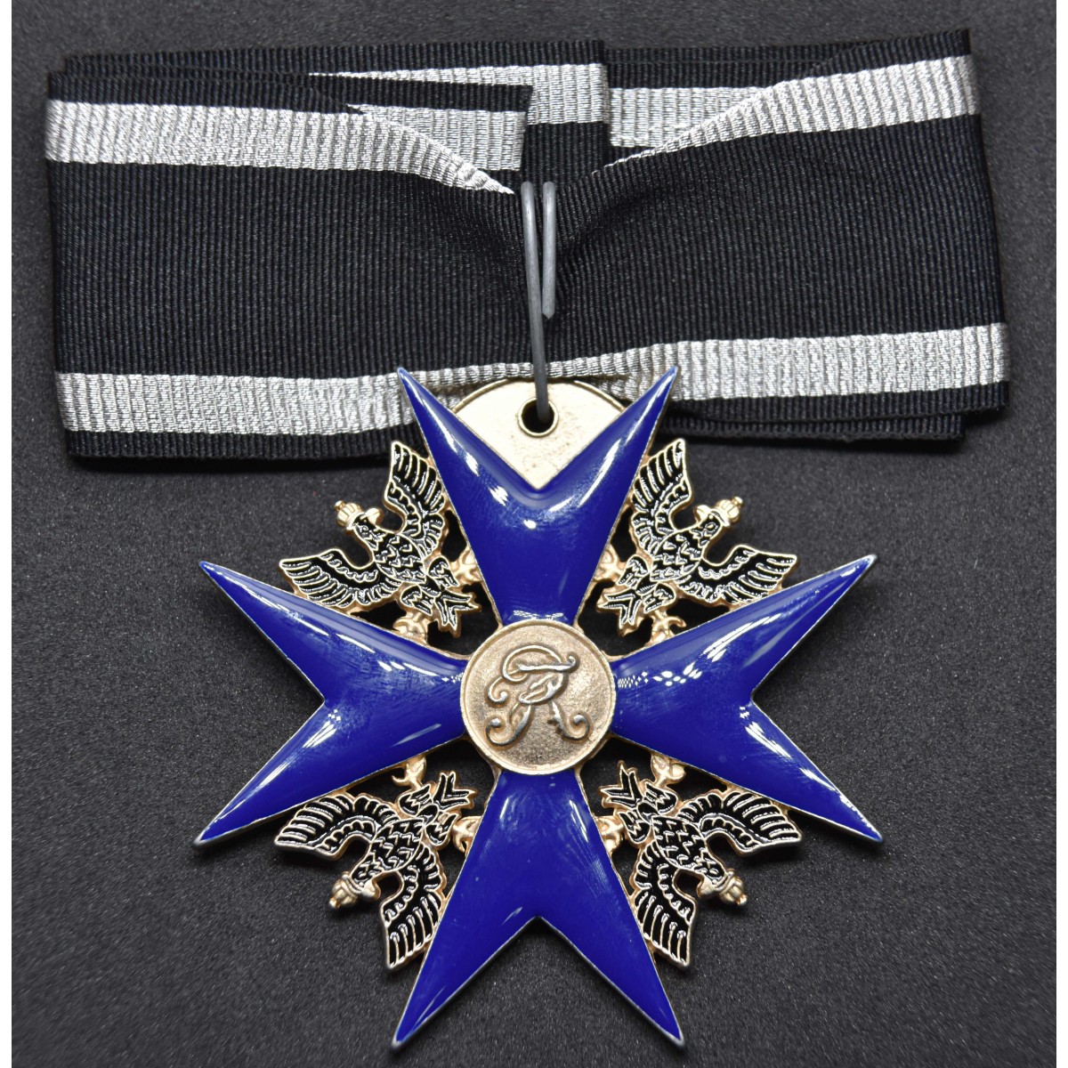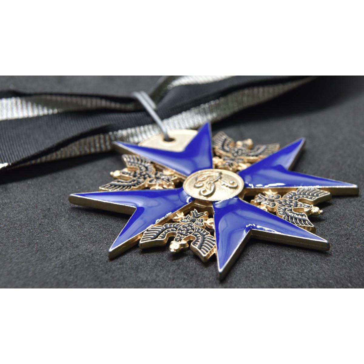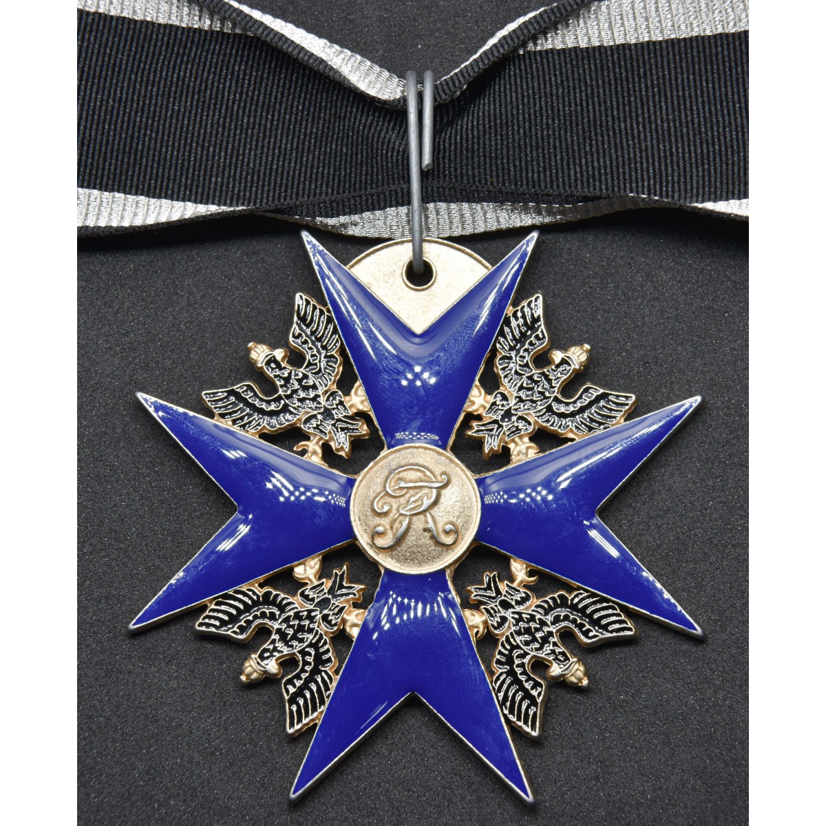 Riproduzione della Croce dell’Ordine dell’Aquila Nera, la più alta onorificenza prussiana, istituita nel 1701 da Federico I. Concessa a sovrani, principi e personalità illustri, era simbolo di suprema distinzione e prestigio nell’élite europea.