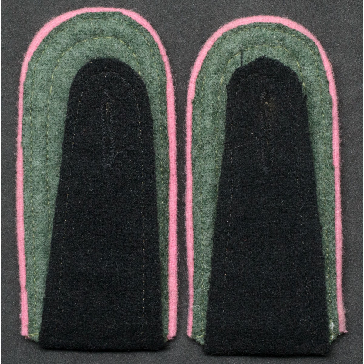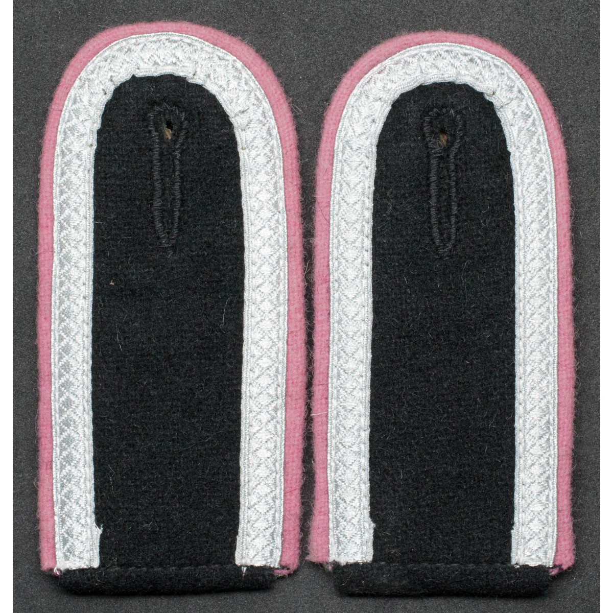Per materiale, colori e finitura, queste spalline rappresentano una delle varianti più eleganti e riconoscibili dell’uniformologia corazzata tedesca del periodo bellico, caratterizzata dall’abbinamento tra nero Panzer, rosa Waffenfarbe e ricamo/tresse argentata da sottufficiale.