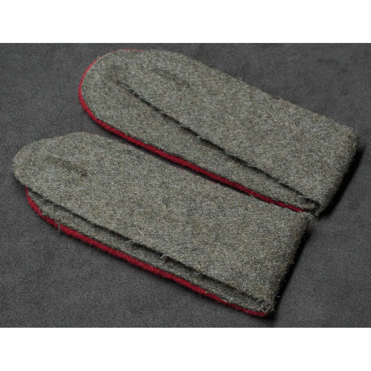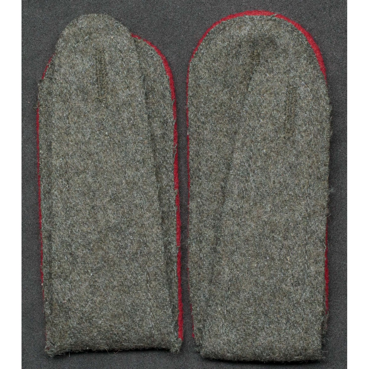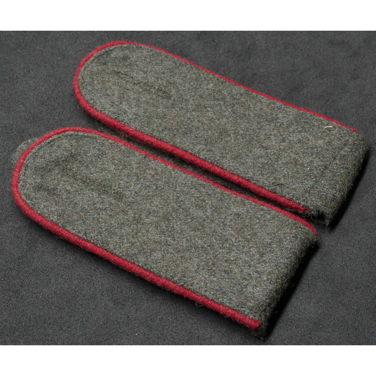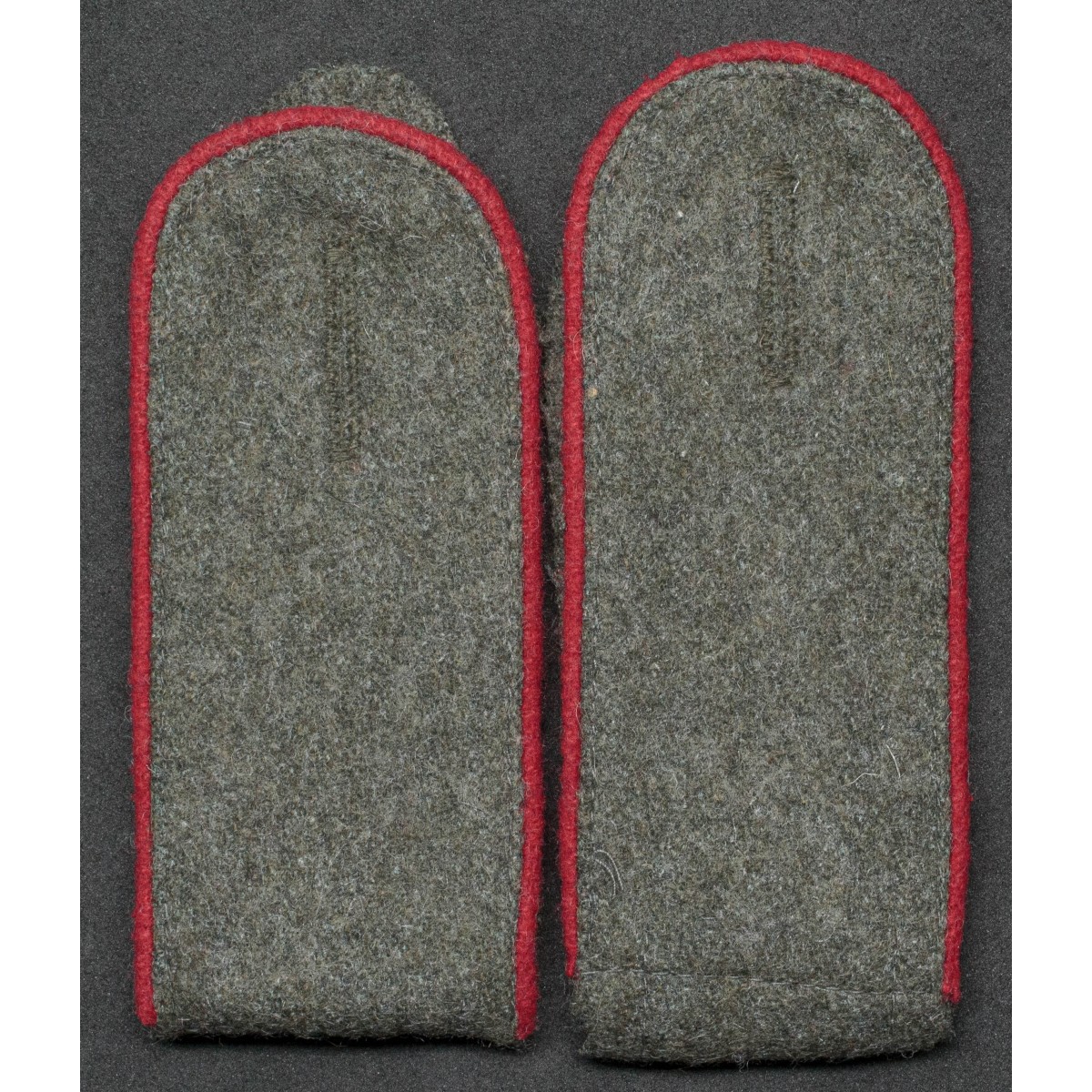 Coppia di spalline per soldati di truppa (Enlisted Men) dei reparti Artiglieria della Wehrmacht. Realizzate in panno feldgrau con piping rosso, colore distintivo delle unità di artiglieria tedesche. Destinate alle giubbe da campo e da servizio, identificavano il personale di truppa appartenente ai reparti di artiglieria.