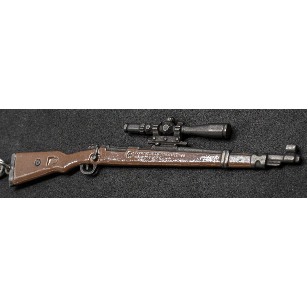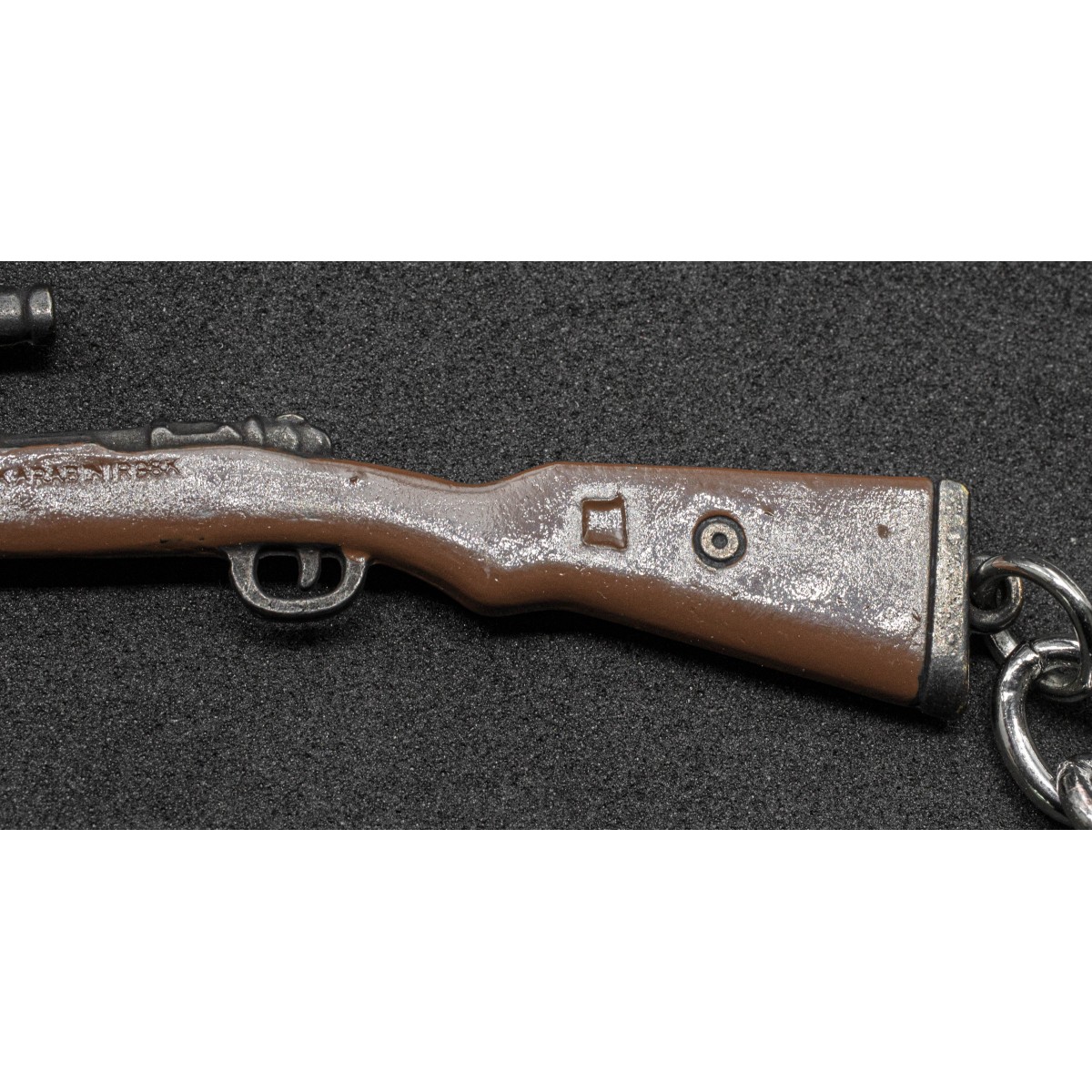 Il portachiavi riproduce con attenzione la struttura dell’arma, inclusi la lunga canna, il calcio in legno sagomato e l’otturatore, elementi distintivi del profilo del Karabiner 98k. Interamente realizzato in metallo, presenta una costruzione solida e una finitura che richiama l’aspetto del fucile originale.